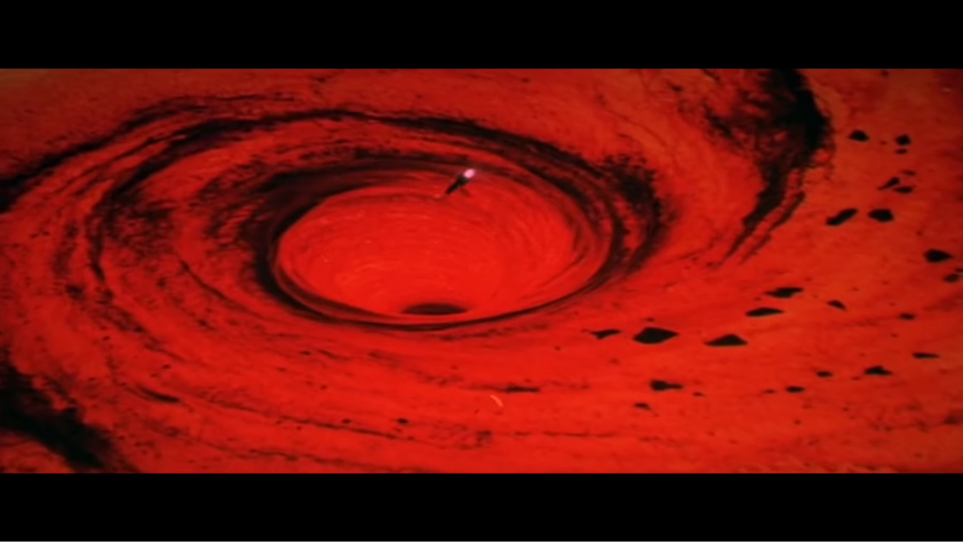 Am Ende des Films, wenn die Cygnus und die Palomino in den Strudel des Schwarzen Lochs stürzen, gibt es eine minutenlange psychedelische Bilderflut - unschwer zu erkennen als Abkupferung der Schlusssequenz aus Kubricks 2001 (das gleiche findet man auch im ersten Star Trek-Kinofilm) - und man bekommt ein Bild der Hölle zu sehen, wo Reinhard mit seinem bösen Henchman-Roboter Maximilian verschmilzt und nun für immer in dessen Innerem gefangen ist. Das ist ziemlich witzig (auf englisch), Reinhard (gespielt von Maximilian Schell) is trapped in Maximilian's shell.