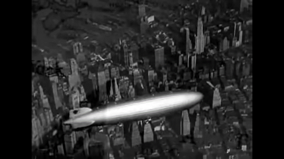 Das Luftschiff ist die Hindenburg, und zwar die echte, das Unglück passierte erst nach Veröffentlichung des Films. Da du den Namen der Hauptfigur noch geheim hältst, haben jetzt die anderen noch eine Chance.