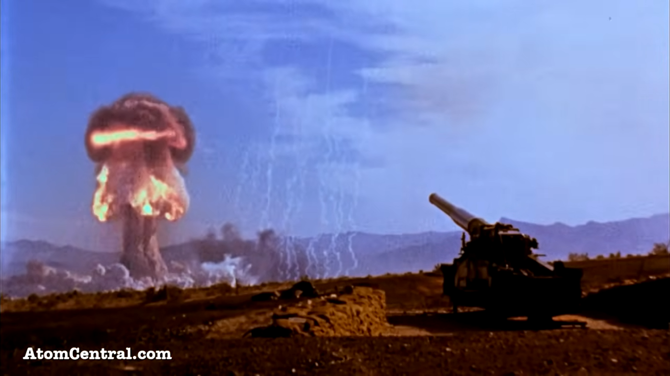 Hier als Appetitanreger ein kleiner Ausschnitt aus dem Film. "The atomic cannon", dies war eine Idee der USA in den 50er Jahren zur atomaren Kriegführung. Eine besonders grosse Feldhaubitze verschoss eine kleine Atombombe, etwa mit der Sprengkraft der Hiroshimabombe, in etwa 10 Meilen Entfernung. Die eigenen Streitkräfte sollten danach in das Gebiet einrücken, bzw. es durchqueren. Da wird die 'Army of the Dead' zur Realität.