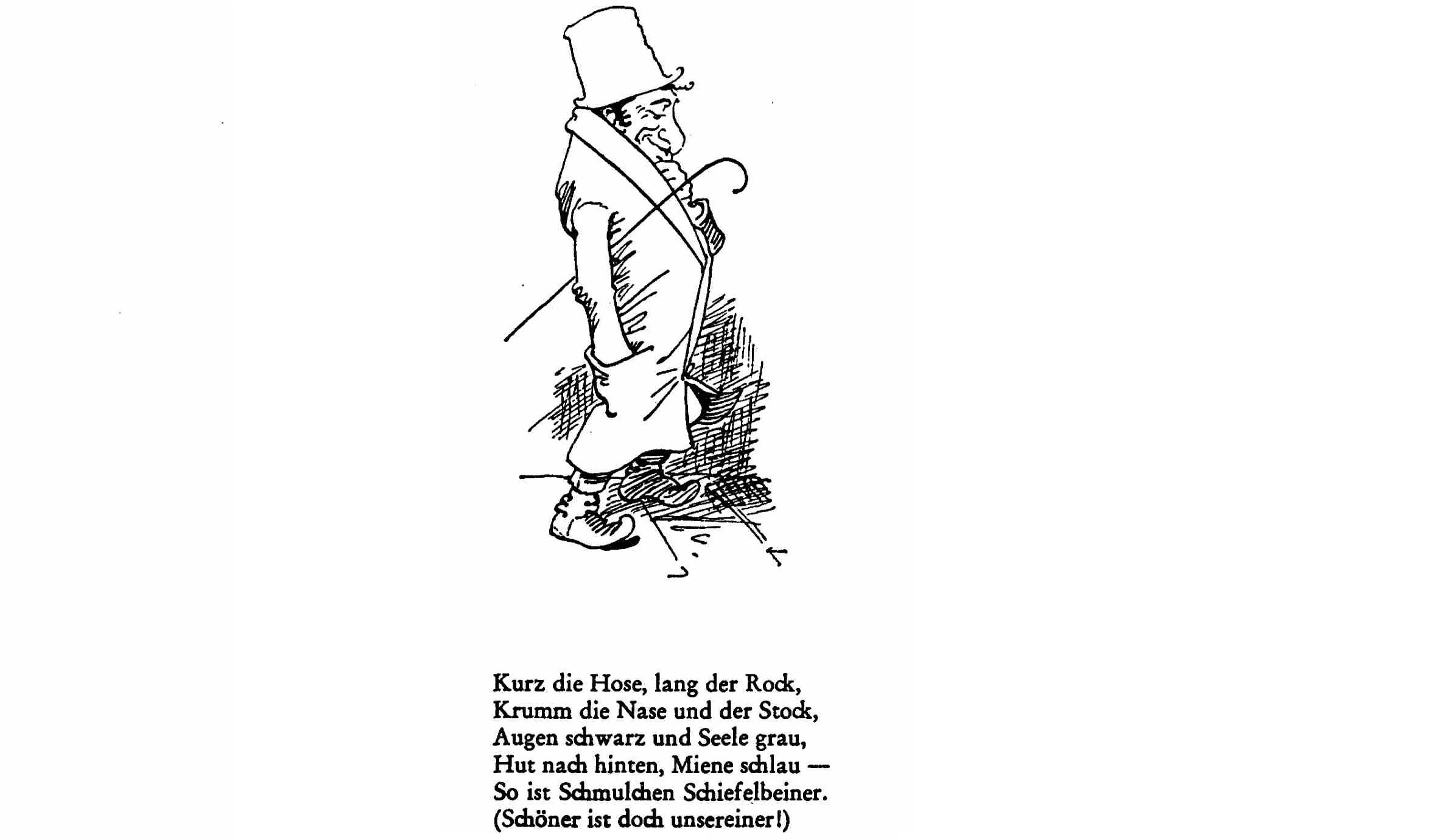 Bei dem genialen Wilhelm Busch gibt es eine Bildergeschichte "Plisch und Plum" über zwei freche Hunde. Darin kommt auch ein Jude vor, der sinnigerweise "Schmulchen Schiefelbeiner" heisst. So wird er beschrieben: