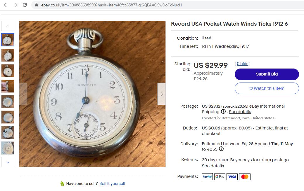Aus der Originalüberschrift "Record USA Pocket Watch Winds Ticks" (das würde etwa heissen "Record (die Uhrenmarke) USA Taschenuhr, lässt sich aufziehen, tickt")...