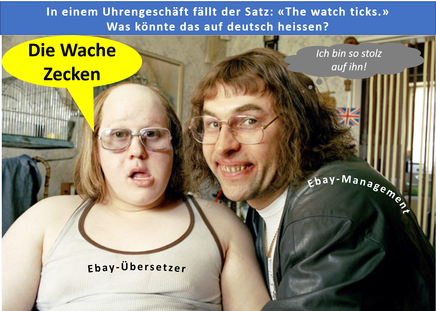 Man ist da also auf einer Verkaufsplattform, wo die Angebote in Kategorien eingeteilt sind, das fragliche Angebot bei "Taschenuhren", als Wort richtig erkannt wurde immerhin Taschenuhr, hätte ja auch als Taschenwache übersetzt werden können. Also gut: In der Kategorie Taschenuhren wird eine Taschenuhr angeboten und da steht noch "ticks". Hm echt schwierig jetzt, das könnte "tickt" heissen, oder "Zecken".