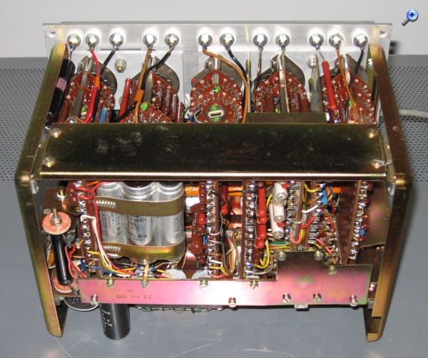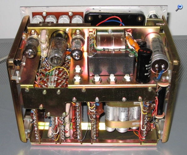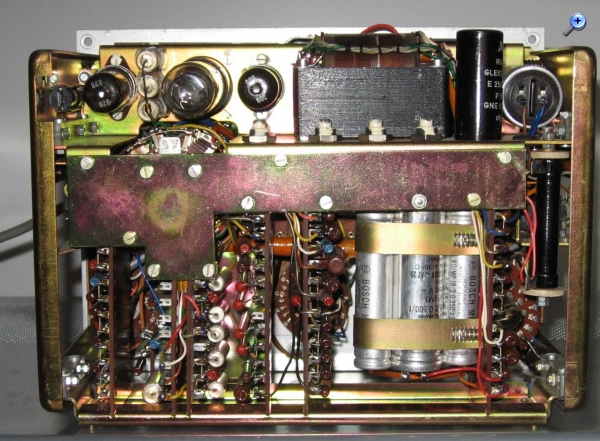 Im Inneren sind Röhren (fest eingebaut!), Netzstromtransformator, Selengleichrichter und Selendiode, Regeltrenntransformator, Glimmstabilisator, Leistungstrimmer, und MP-Kondensatoren eingebaut.