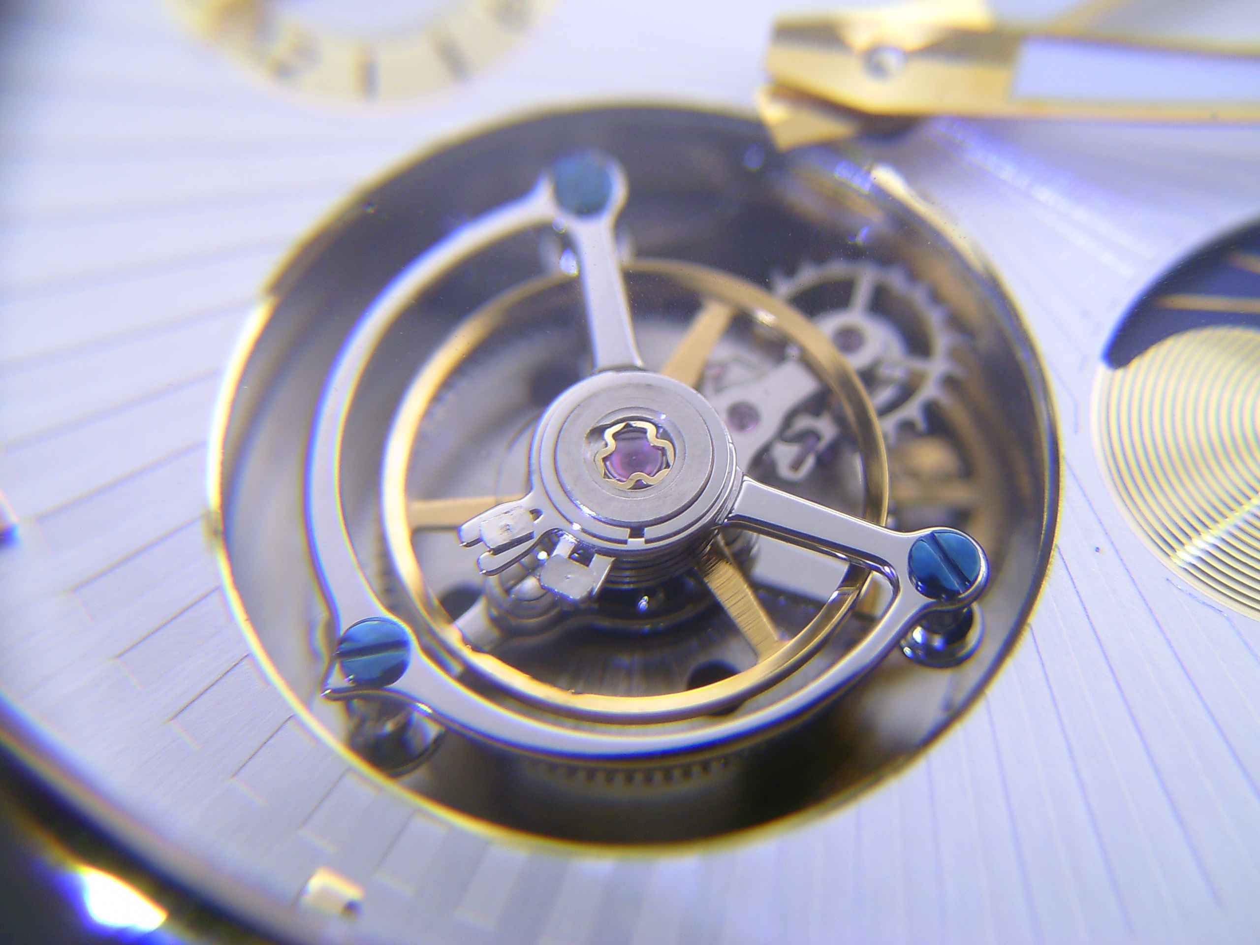 Der Tourbillonkäfig. Die kleine Spitze links unten dient als Sekundenzeiger.