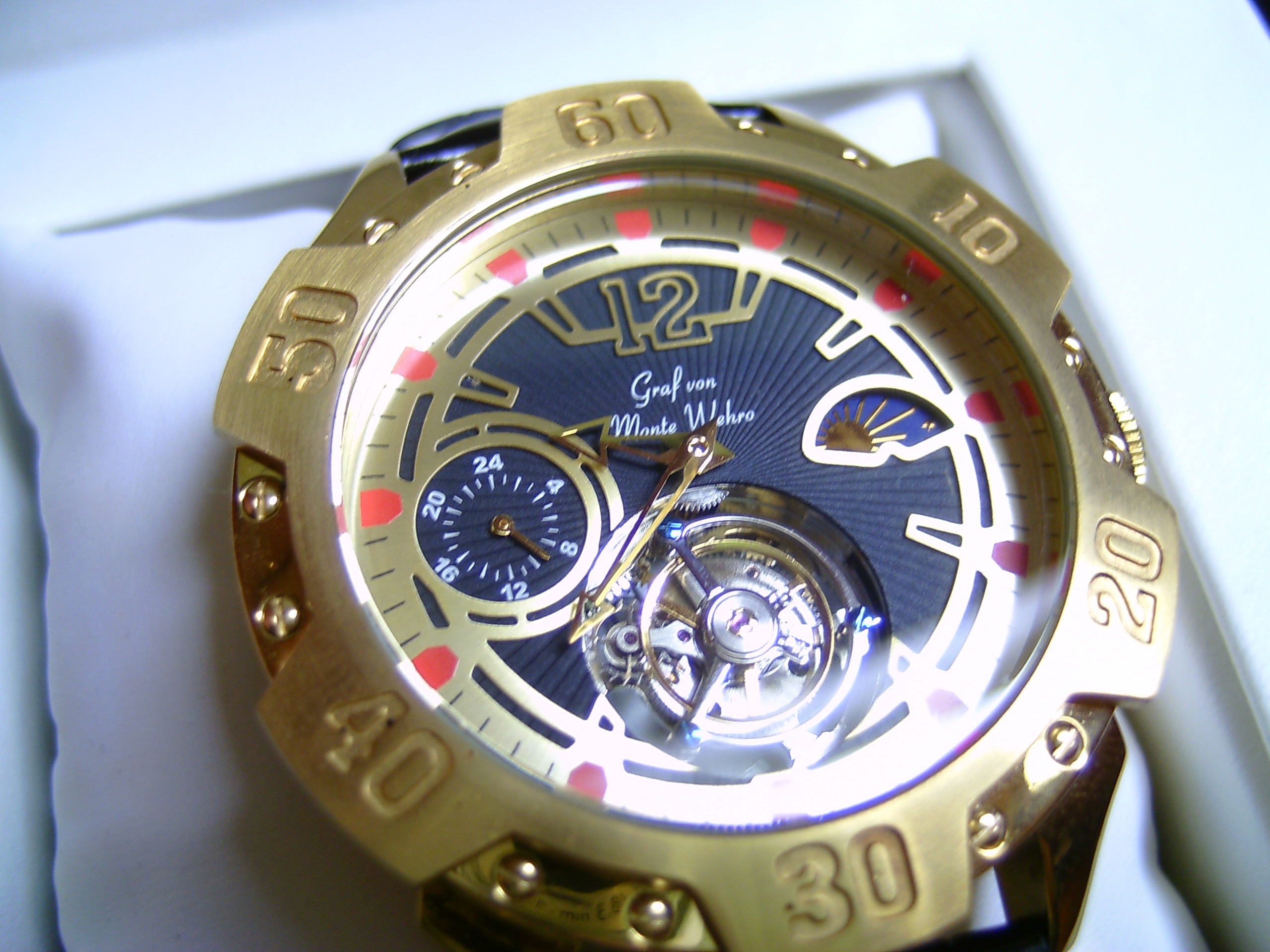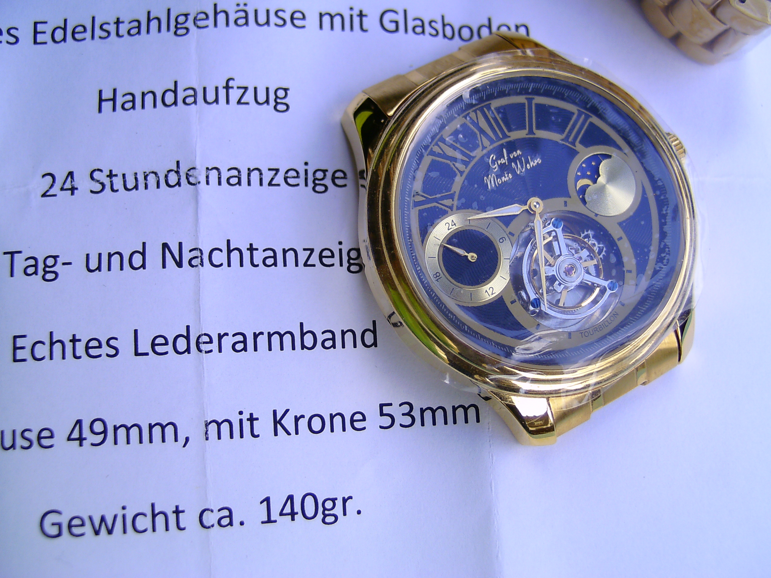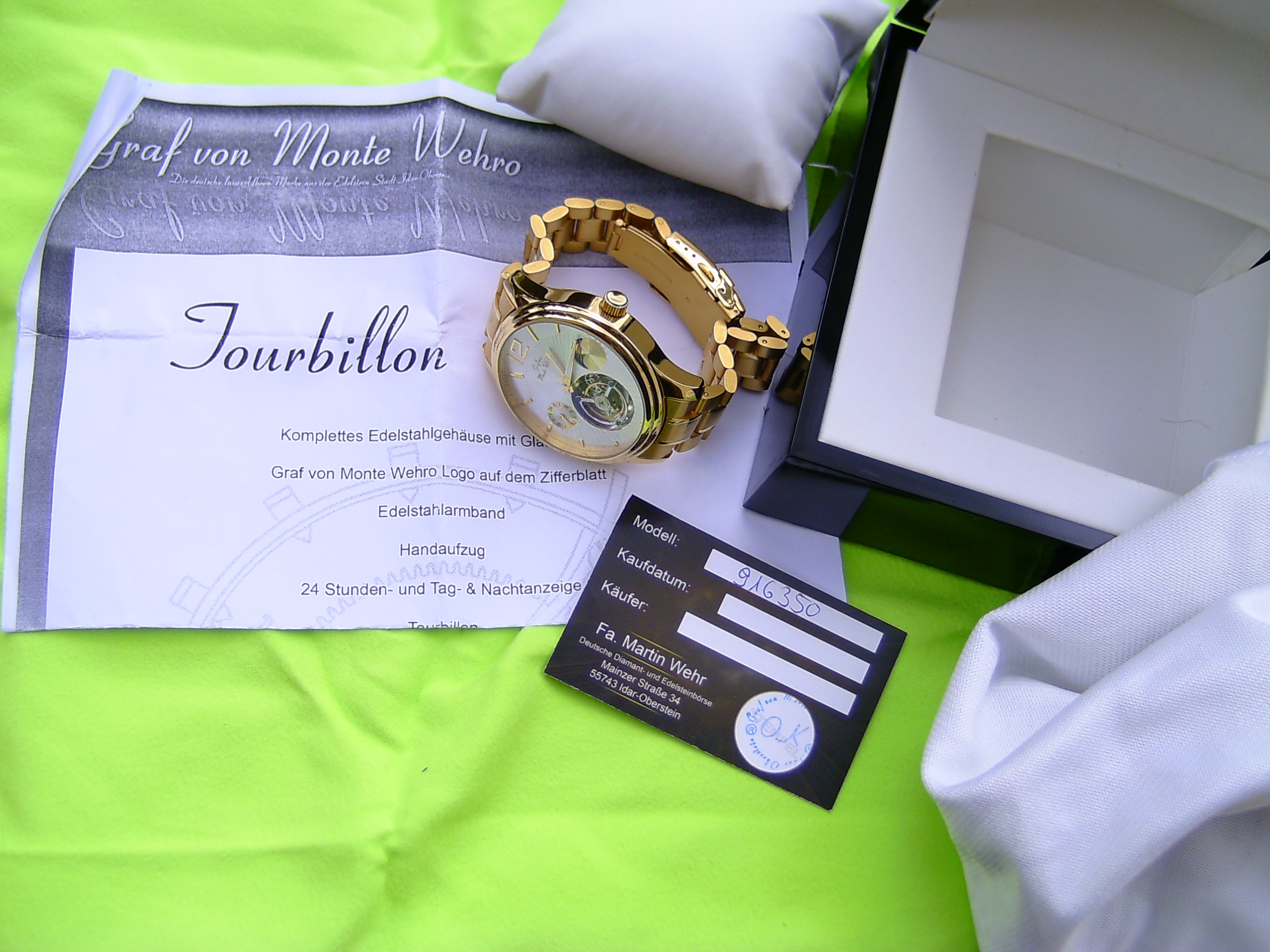 08 Sep. 2019 19:59Eine Tourbillon-Armbanduhr der Marke "Graf von Monte Wehro" Eine Firma, welche es nicht mehr gibt, und somit deren Produkte immense Wertseigerungschancen haben.