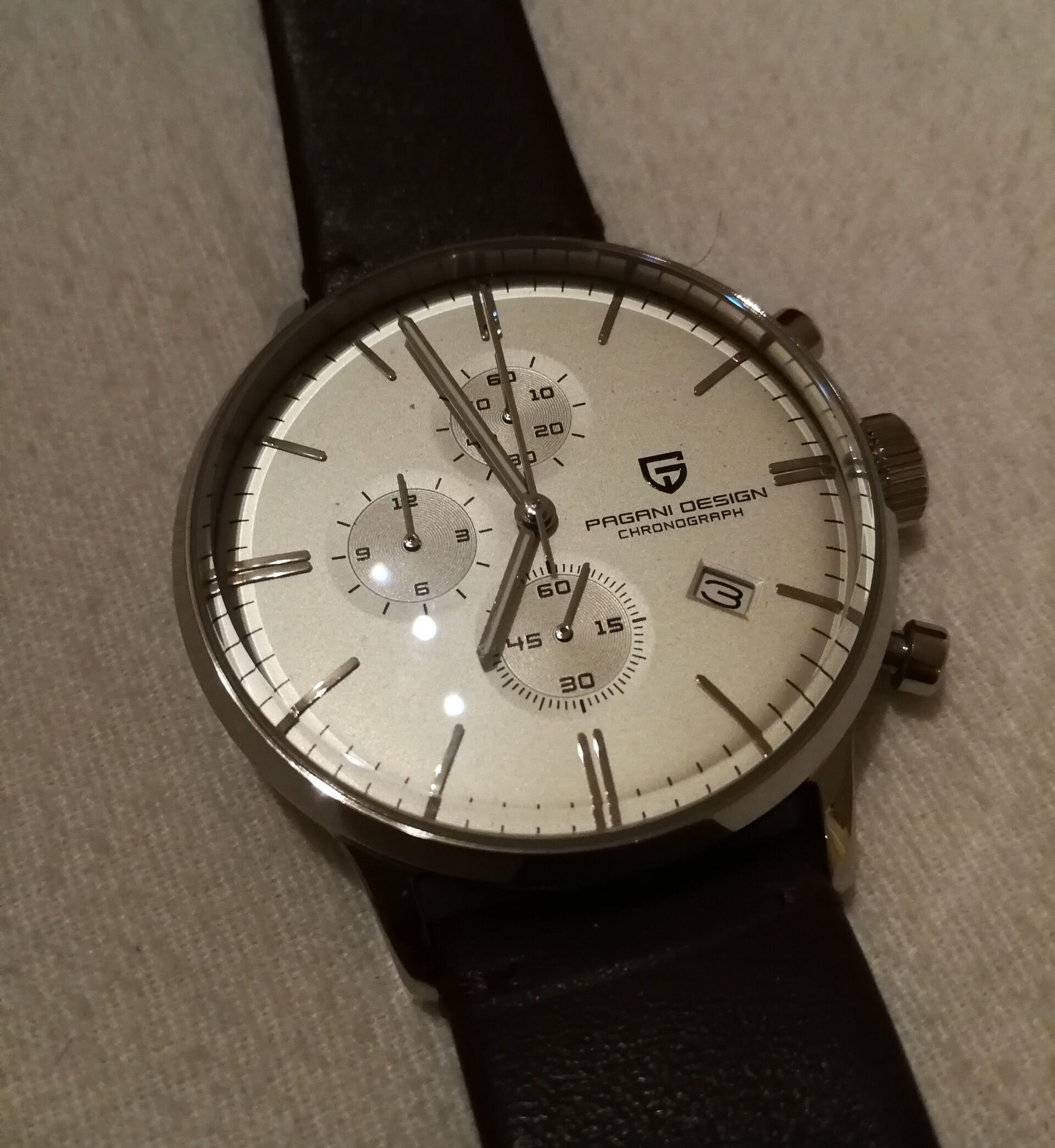 Das Uhrwerk soll angeblich ein Mingzhu 3886 sein, davon habe ich noch nie etwas gehört, aber immerhin ist ein Sekundenstopp vorhanden. 44mm Durchmesser (ohne Krone), polierter Edelstahl, angeblich 5ATM wasserdicht.