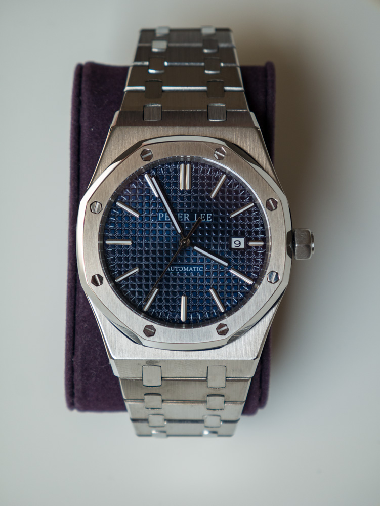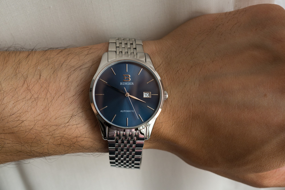 Bin ziemlich zufrieden mit dem Ührchen. Gute Verabeitung, massives Band und gute Schliesse, kräftige Lume und sauber gesetzte Indizes. Manch einer mag das Band als ein wenig zu scharfkantig empfinden, aber ich mag das. Ich finde manches Band mit allzu stark gebrochenen Kanten einfach zu rundgelutscht