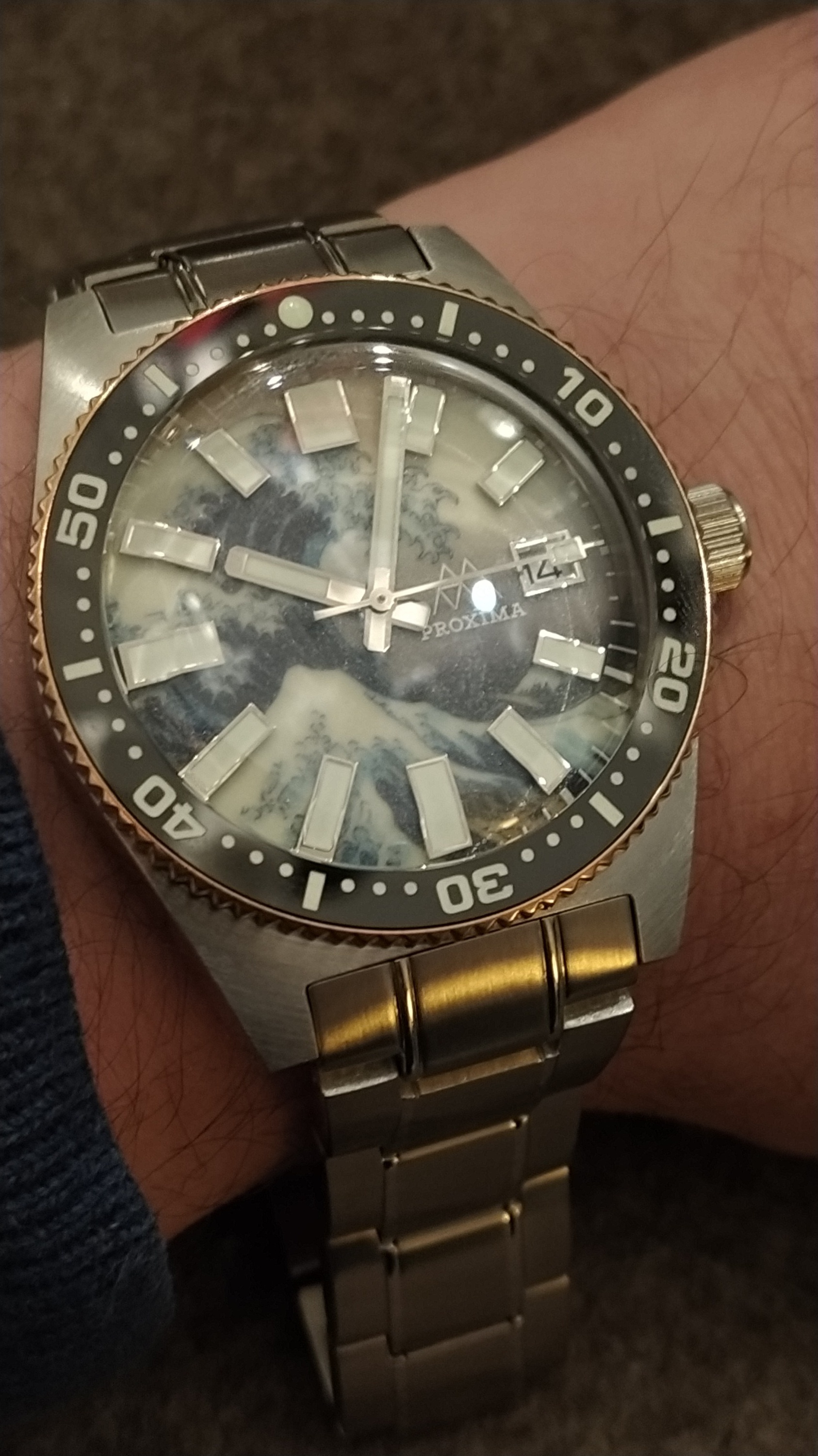 03 Jan. 2020 09:12Ja, beide basieren auf den Hommagen für die MM300 & ich glaube die 62Mas (könnte aber auch die 65 sein - ich muss mal die Gehäuse genauer vergleichen) und haben somit die üblichen NH35 drin. An der Kanagawa hat mein Händler nun zum ersten mal für das Gehäuse ein Stahlband angeboten - ich finde es ganz ok. Beide Bänder sind mit Splinten, recht großen einzelnen Gliedern & wieder mit der recht kurzen Schließe (3 Löcher zur Feinverstellung) und dem leider etwas abstehenden letzten Glied an der Schließe auf der 6-Uhr-Seite... Aber das ist mMn Jammern auf hohem Niveau. Läßt sich mit einem Schließentausch leicht beheben.