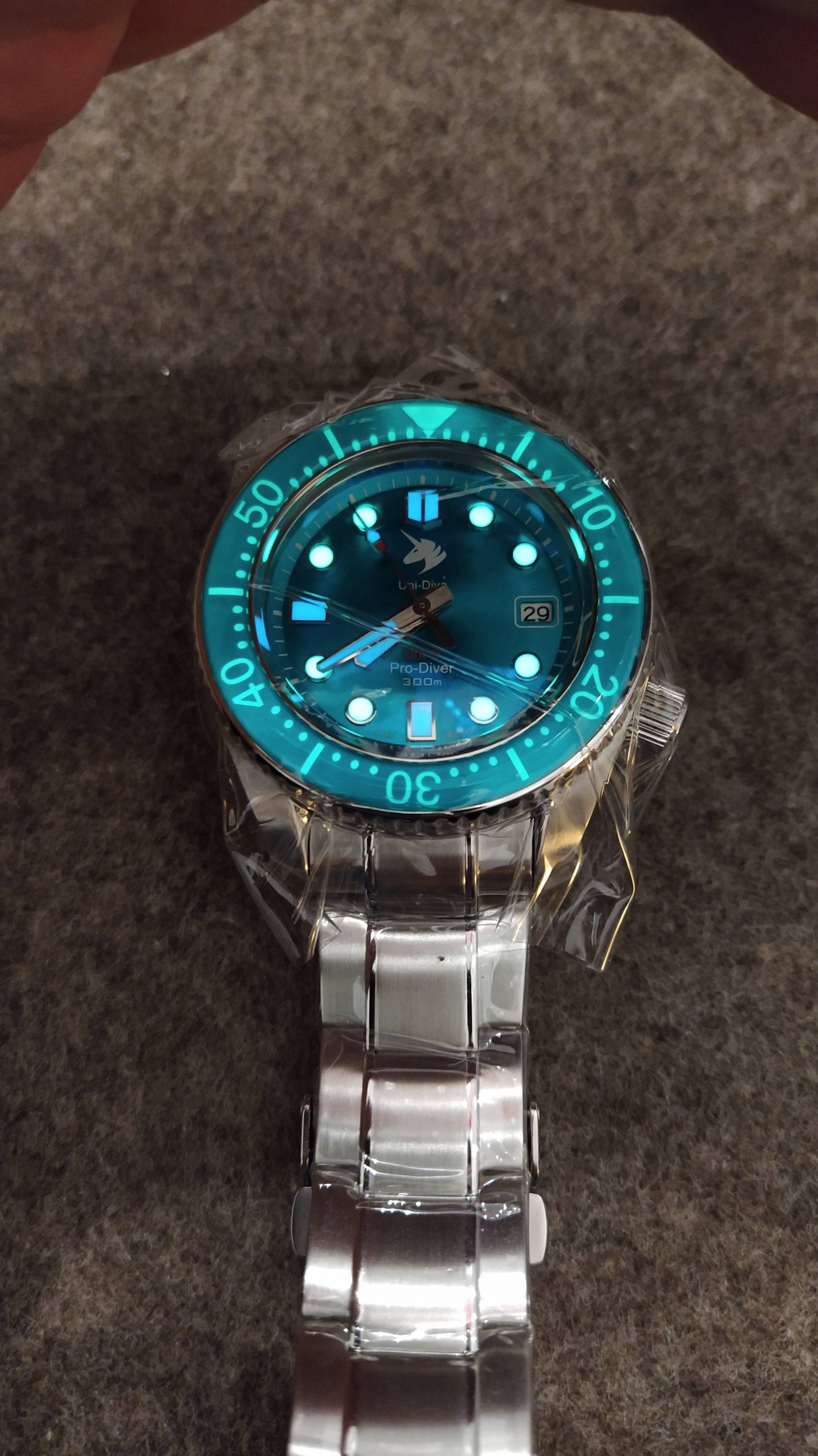 Die Lume ( Blau / Grün ) ist sensationell, das Band zwar "nur" gestiftet aber vollmassiv und vom reinen Gewicht ( Uhr + Band ) her:
