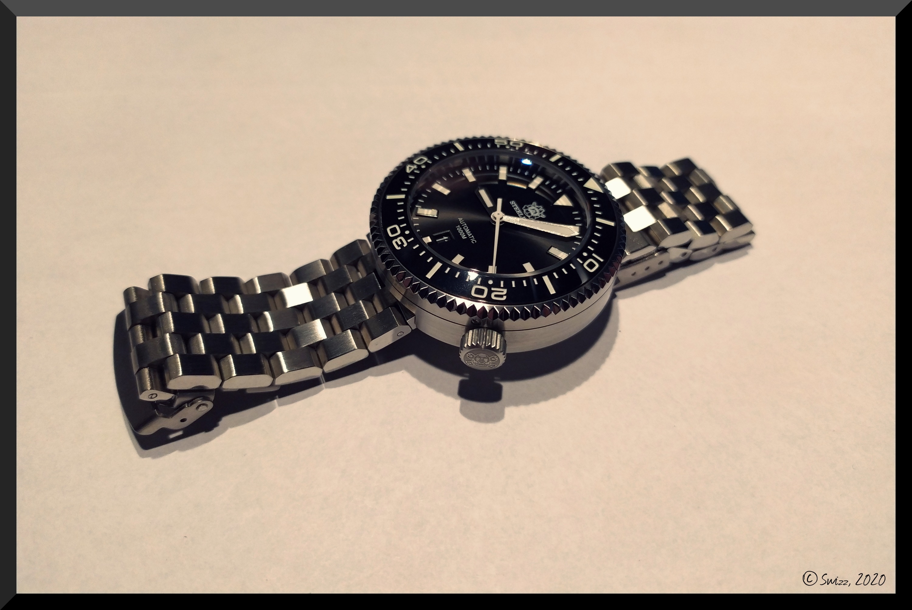 selbst das Steeldive Logo an der Aufzugskrone ist absolut mittig zentriert im zusammengeschraubten Zustand.