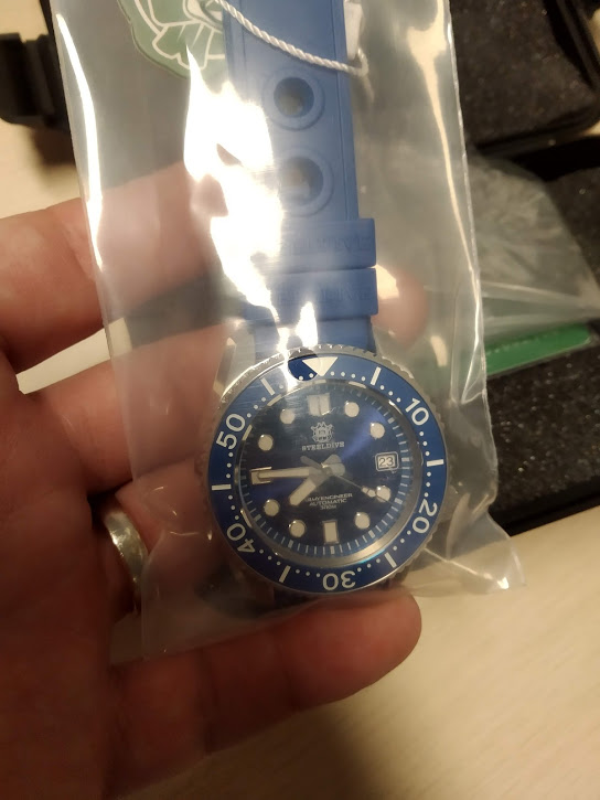 Bestellt waren die 1968BL-SS with logo (das ist die MM300-Hommage in blau mit Stahlband), die 1940BL with logo (die Flieger in blau mit Stahlband) und die 1975J-05L with logo (die Tuna-Hommage mit Kanagawa-Dial & Stahlband). Nr. 1 & 3 mit "legalem", neuem Aufdruck...