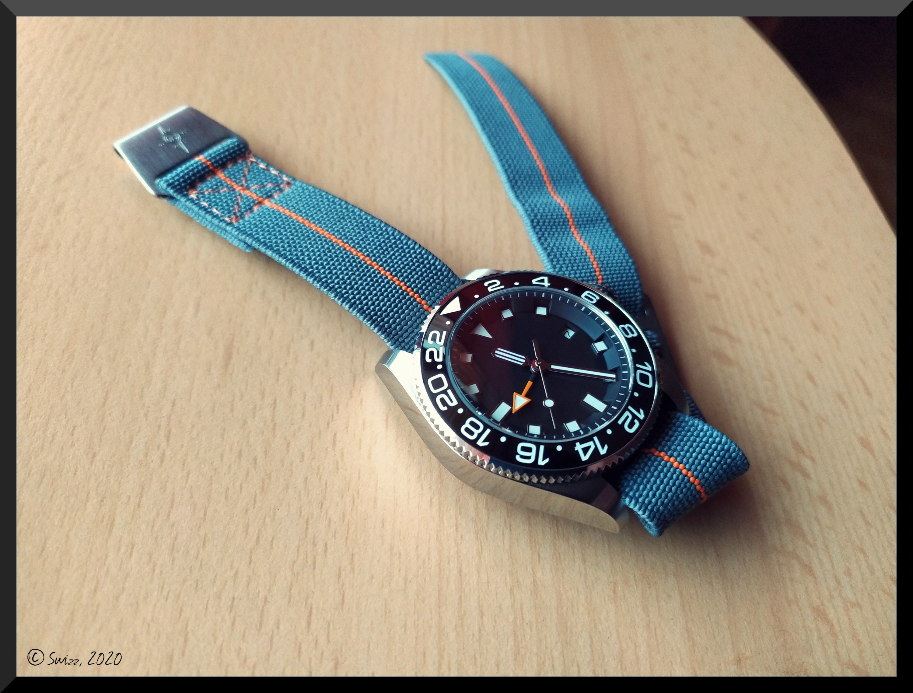 Also die letzte Box geöffnet: Die 1940 in schönem blau. Band angepaßt und aufgezogen und gestellt - puh, die läuft, aber irgendwas wirkt ungewohnt/störend. Nochmal in die Bestellung und auf meine schwarze geschaut: verdammt, ich hatte die Version mit den Spitzen Zeigern und den größeren/schlankeren Ziffern bestellt... Arrgh...