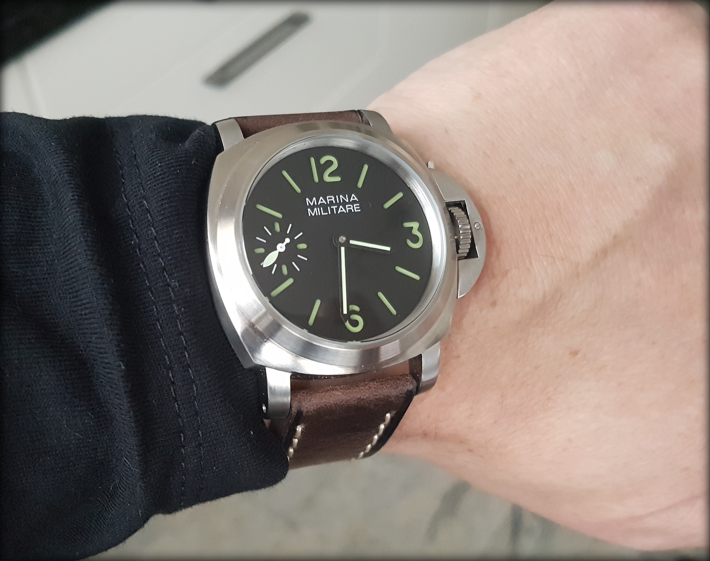 44mm mit brushed/gebürstet/mattiertem Gehäuse. Aufschrift ZB relativ egal, Farbe der Leuchtmasse auch egal, grün weiß oder orange, was es so gibt. Band auch wurscht. Werk mit Seagull Handaufzug.