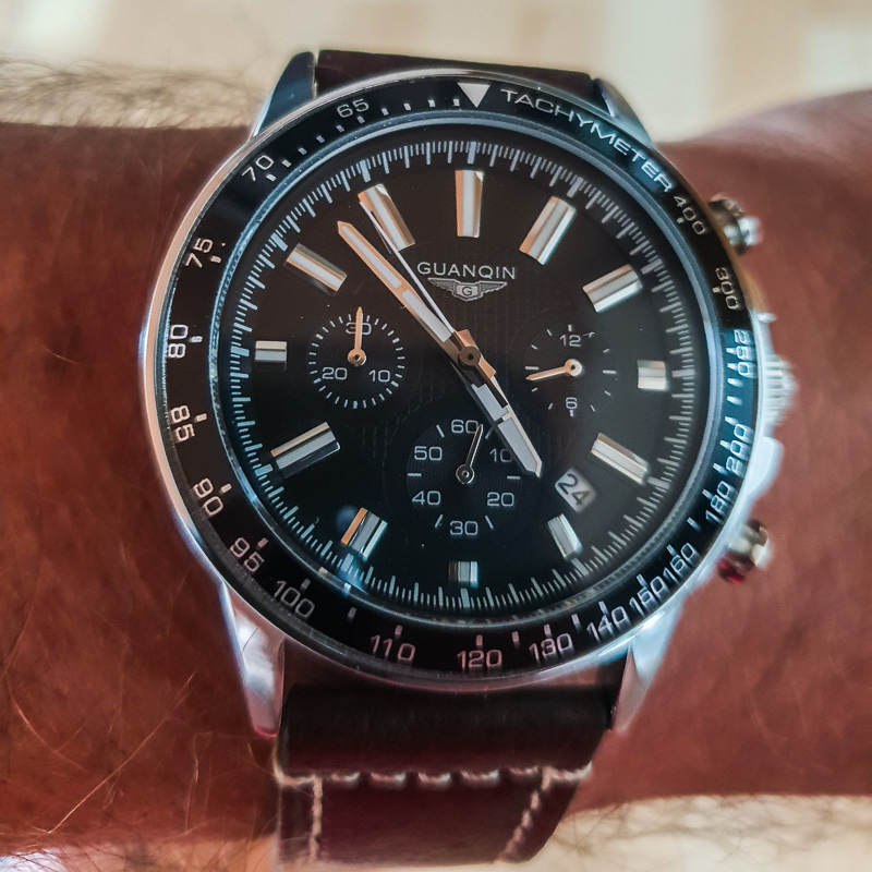 Die Uhr selbst ist Top! Ok, die Kronenverschraubung ist tatsächlich fummelig und absolut für die Füß', da die Uhr eh kaum wasserdicht ist, da reisst es eine Verschraubung auch nicht raus. Aber sonst? Die Indizes sitzen genau da, wo sie sein sollen, der Sekundenzeiger parkt exakt auf der 12 und kehrt auch sauber dorthin zurück. Auch der Rest ist so klasse verarbeitet, dass die Uhr deutlich teurer wirkt als sie letztlich ist.