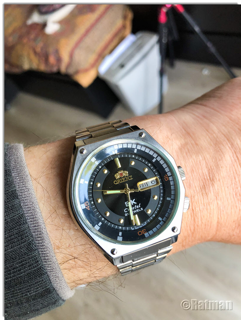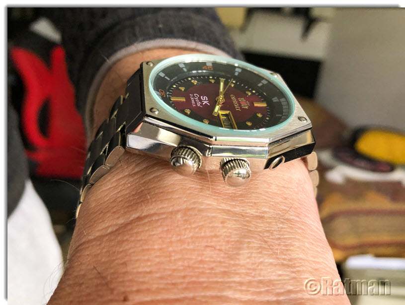 Und Dirk hatte Recht: Dieses asymetrische Case hat was. Es hebt die Uhr deutlich von anderen Tickern ab und gibt ihm etwas eigenständiges. Schön, dass der Hersteller dieses Teil in fast identischem Design wieder hat auferstehen lassen. Einziger Nachteil bei dieser Uhr ist, dass aufgrund des Case nur das Original-Band mit den speziellen Endlinks so richtig passt. Ein Ersatzband könnte höchstens mit geraden Anstößen ohne spezielle Endlinks einigermaßen passen. Ein Kunstlederband oder ein Nato würden vermutlich den Charakter der Uhr zerstören. So bleibt halt erstmal das Originalband montiert. Mal schauen, ob Orient passende Bänder anbietet, die auch am Original passen....