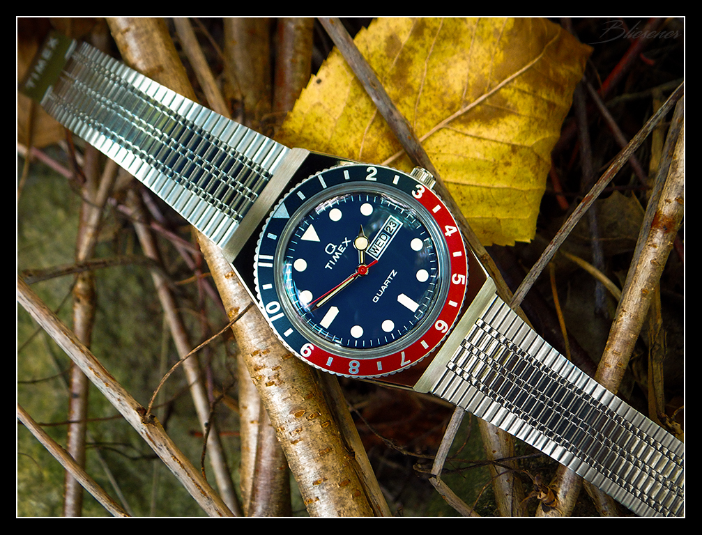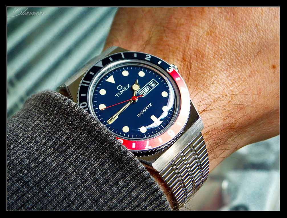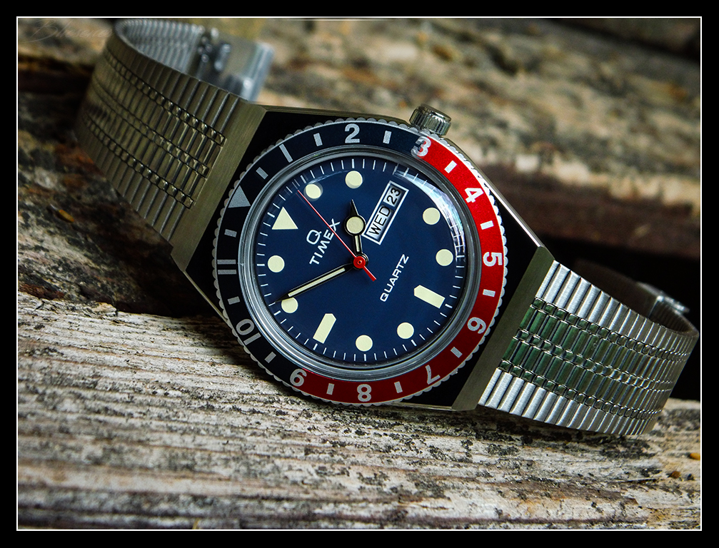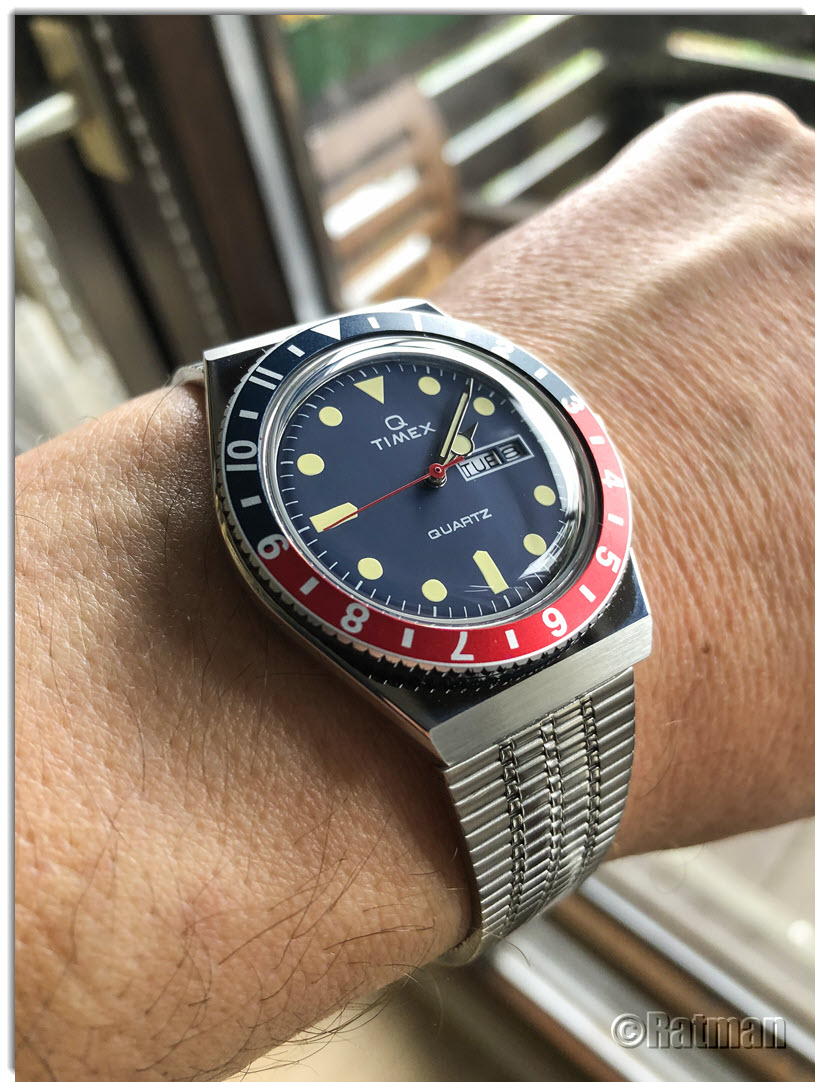 Vor einer Weile hat mich eine Uhr, die im UF gezeigt wurde, extrem angefixt. Die Farbgebung des Zifferblatts, das extrem ungewöhnliche Band, das alles erinnerte mich an eine Uhr, die mein Vater in den 70ern getragen hatte, auch wenn die damalige Uhr keine Pepsi-Lünette hatte. Nach ein wenig Recherche fand ich heraus, dass es sich um ein Re-Issue der TIMEX "Q" handelt. Ich stellte aber schnell fest, dass das Modell bereits überall ausverkauft ist. Auf Ebay waren aber mehrere zu finden, allerdings zu extrem unterschiedlichen Preisen von unter 200,- EUR bis weit über 500,- EUR. Nach mehreren Auktionen, bei denen ich mitgeboten hatte, fand ich ein Angebot zum Sofort-Kauf in UK für 220,- britische Pfund, umgerechnet ca. 247,- EUR. Dazu kommen nochmal 26,- EUR Versandkosten.
