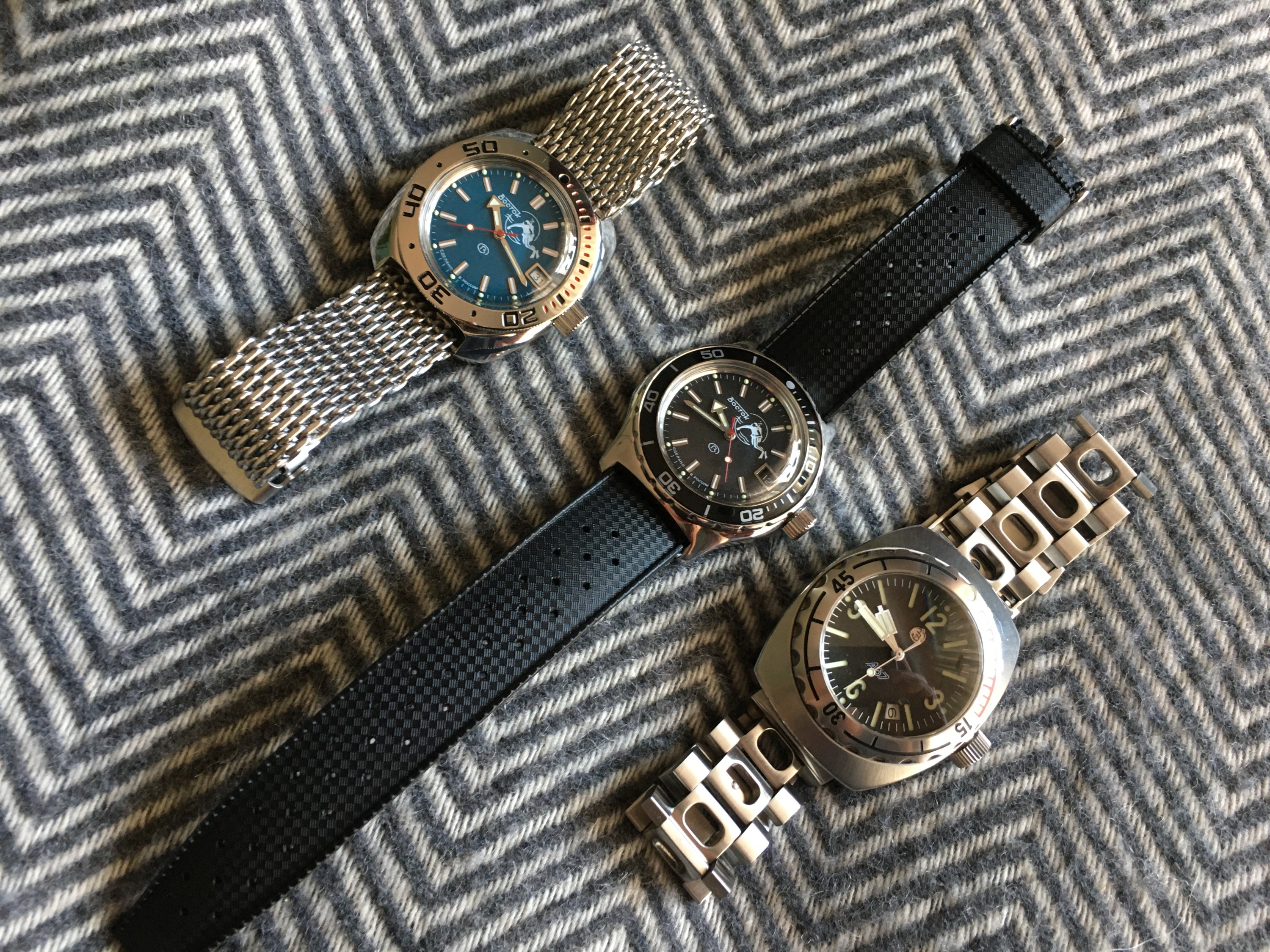Hier sind meine drei Uhren von Vostok (BOCTOK)