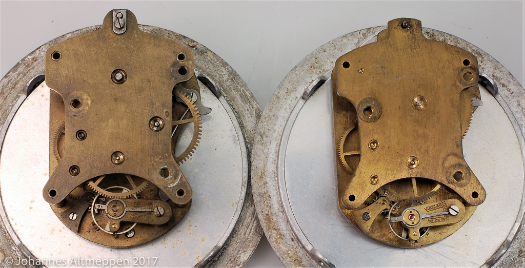 Zifferblatt-seitig unterscheiden sie sich nur durch die Beschriftung der Gang-Dauer. Die Uhrwerke sind nicht signiert. Sie haben bei gleicher Form und Anordnung der Trägerplatinen jedoch einen deutlich unterschiedlichen Aufbau. Dementsprechend haben die Gehäuse mit 27 bzw. 19 mm eine unterschiedliche Tiefe