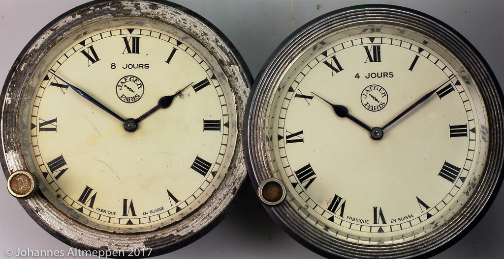 Bei einem Besuch in Moskau im Jahr 1996 habe ich auf dem zentralen Flohmarkt „Vernisage“, im ehemaligen olympischen Dorf Ismailowa, zwei frühe Borduhren von „JAEGER PARIS“ mit dem Hinweis „FABRIQUE EN SUISSE“ entdeckt.Der Händler, der eine größere Anzahl Flugzeug-Borduhren anbot, versicherte, dass diese Uhren aus alten russischen Flugzeugen stammen. Ich habe keinen Zweifel an dieser Aussage des Händlers. Ob es sich bei den beiden Uhren jedoch Borduhren handelt, die „Jaeger“ (auch) für Flugzeuge gebaut hat oder um Uhren, die in der jungen Sowjetunion angesichts der Mangelwirtschaft u.a. für Flugzeuge genutzt wurden, kann ich nicht beurteilen.Es war eine 8-Tage-Uhr und eine 4-Tage-Uhr.