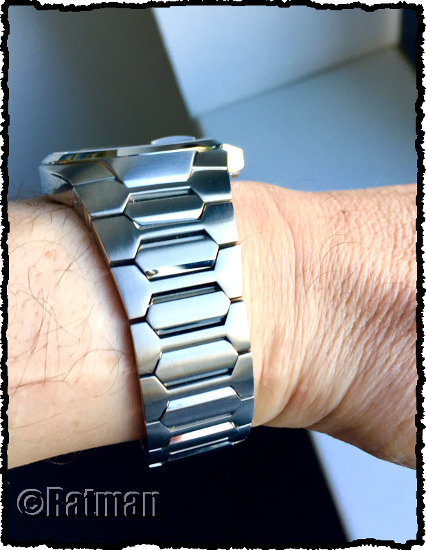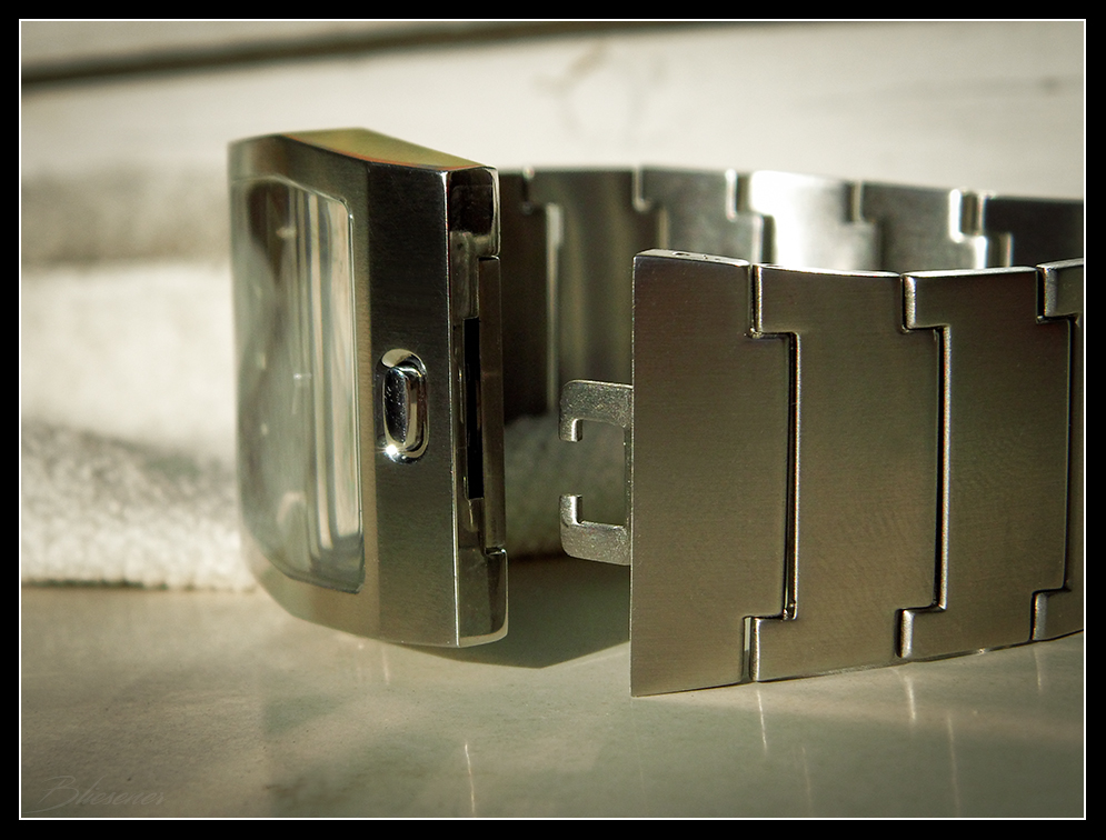 Das Ührchen hat erfreulich schnell den Weg über den großen Teich geschafft und ist gestern eingetroffen. Das Kürzen des Bands ging erwartungsgemäß schnell und heute durfte die Neue mit ins Büro. Ich bin sehr angetan von dem Ding, ist sehr gut verarbeitet und die Butterflyschliesse funktioniert stramm aber ohne großen Kraftaufwand.