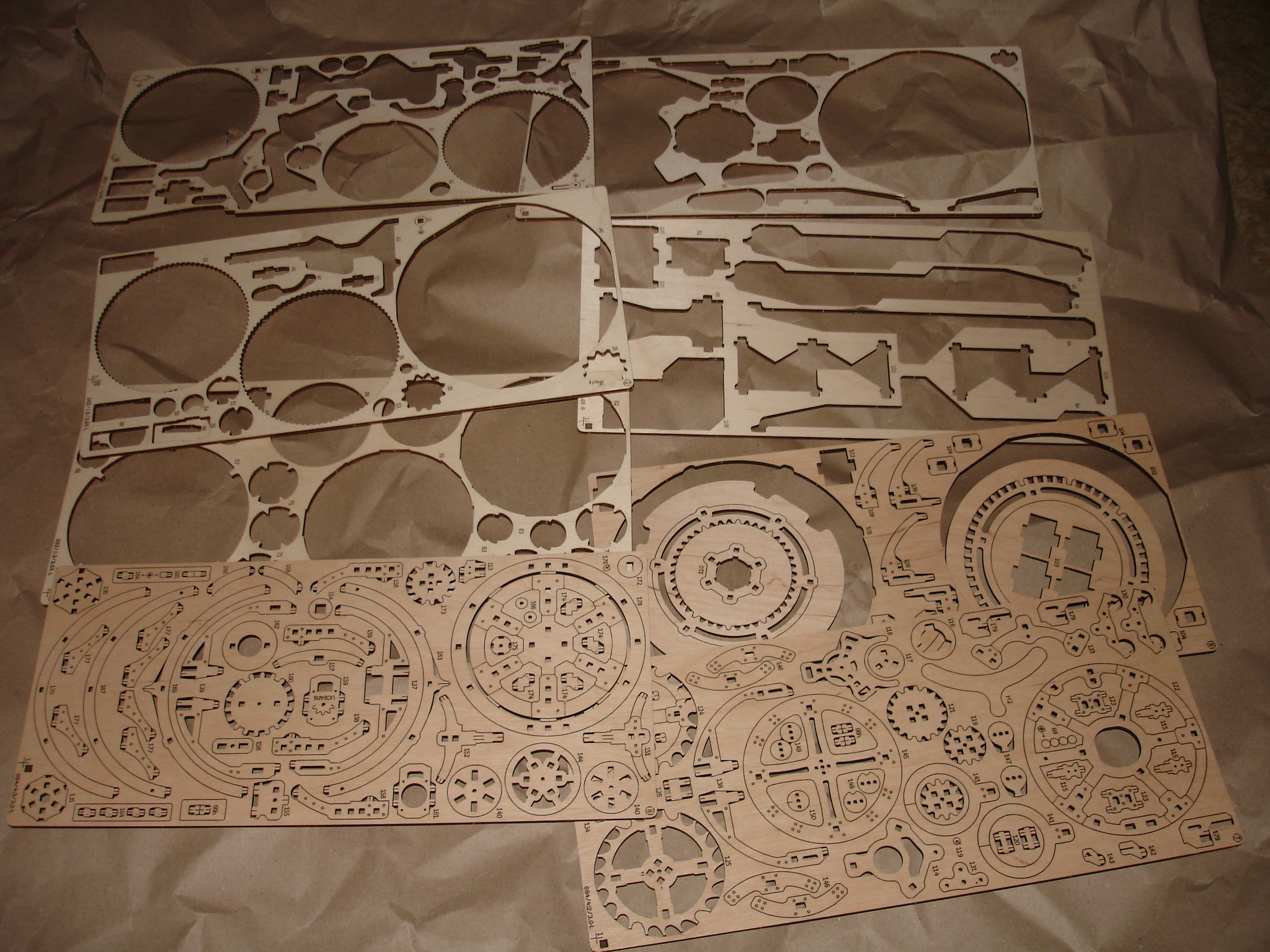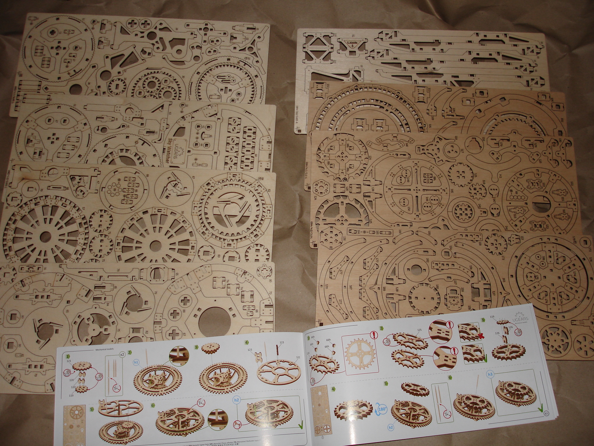 Sie sind aus Birkensperrholz, natürlich sind auch Teile aus Metall (Achsen, Federn, Scheiben) dabei. Selbst Schmirgelpapier zum Entgraten der Holzteile und Kerzenwachs zum Schmieren der Zahnräder ist dabei.