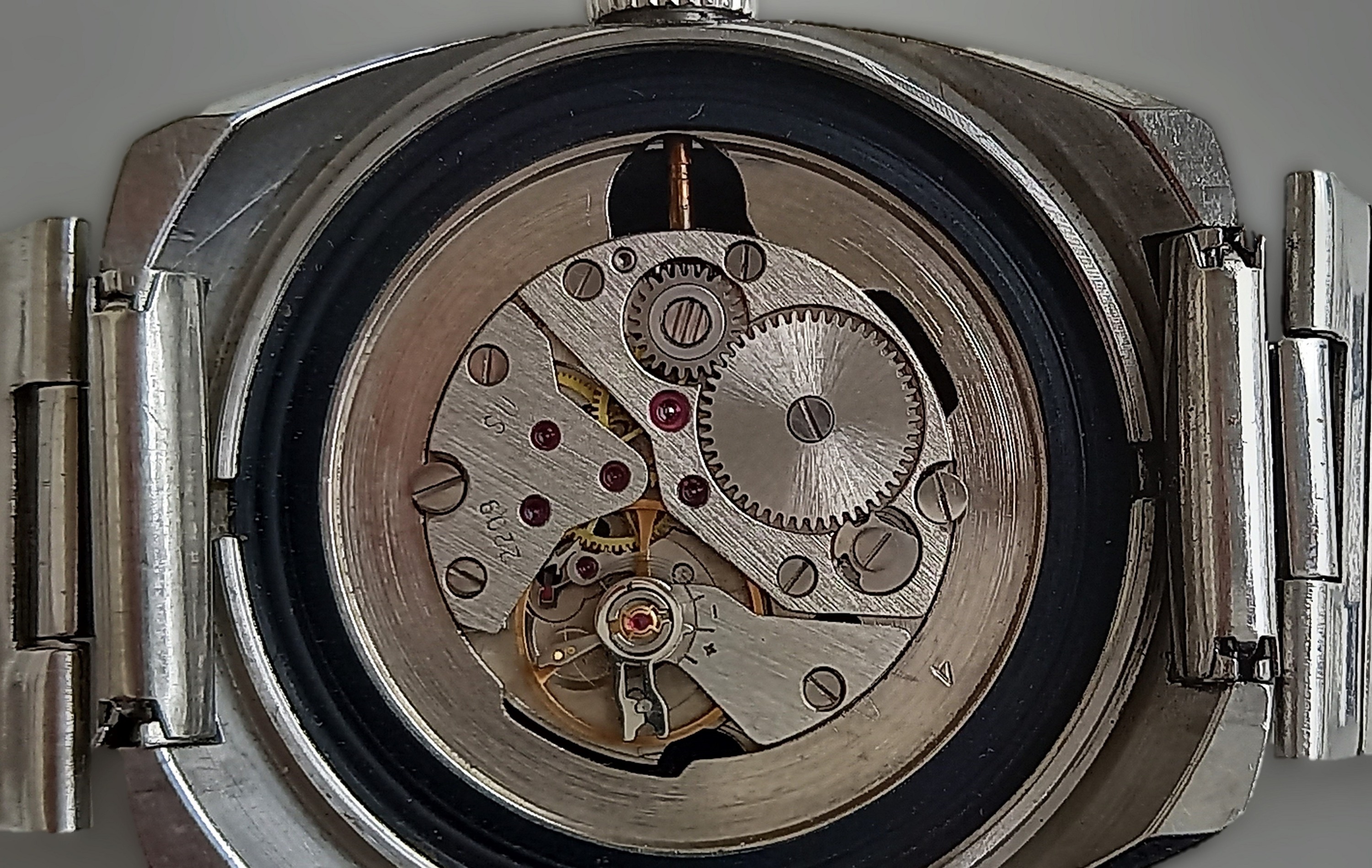 Das verwendete Werk, ein Kaliber Wostok 2209 ist klein im Vergleich zu dem grossen Gehäuse (bei sowjetischen Kalibern aller Uhrenhersteller geben die ersten zwei Nummern der Kalibernummer immer den Durchmesser in mm an; bei den 22xx-Werken also 22 mm). Es ist sehr ähnlich dem Kaliber 2234 in meiner Komandirskie, die ich neulich vorgestellt habe. Dort ist das Werk kurz beschrieben und es gibt dort auch eine Revisionsanleitung von Youtube:
