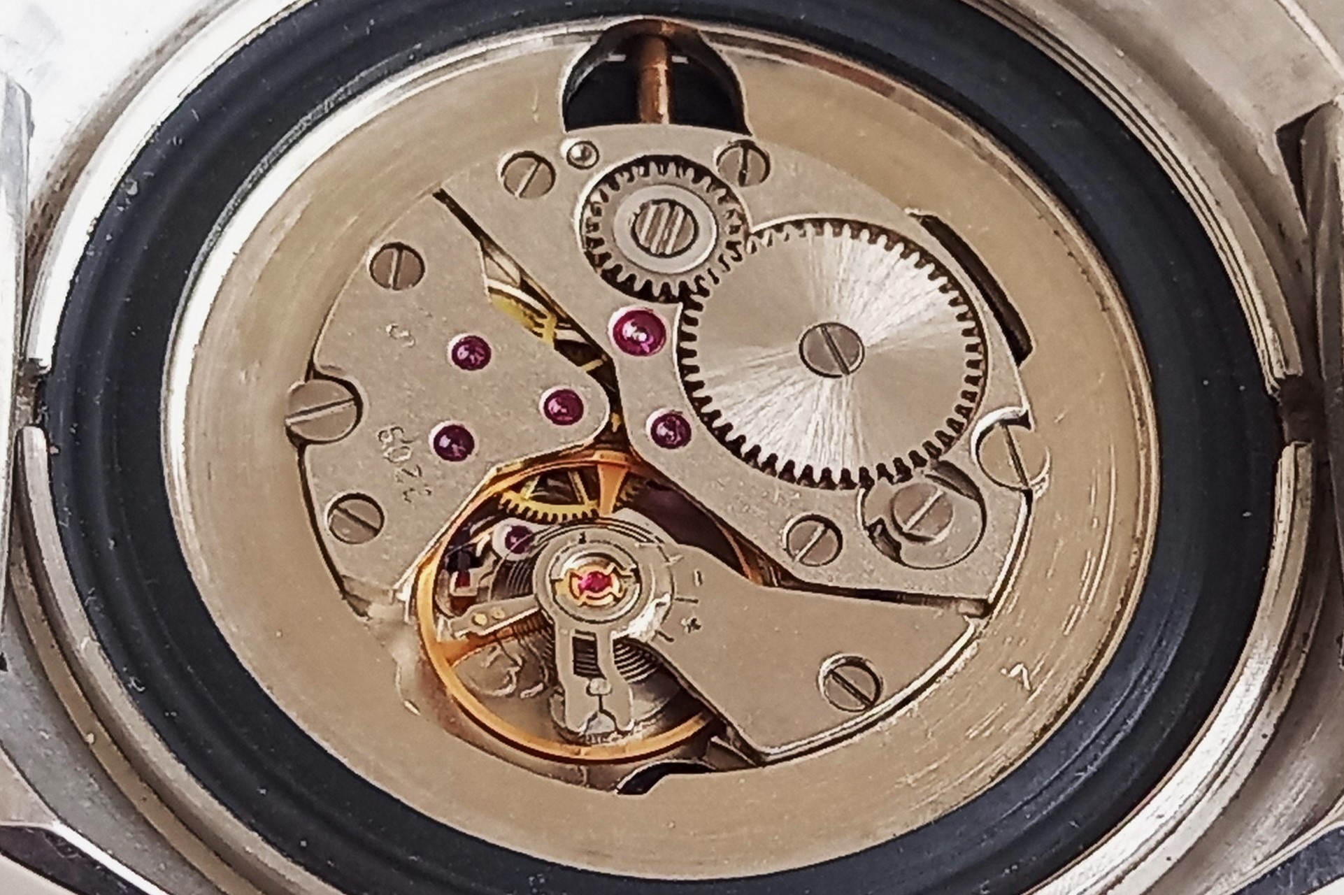 Es gab bei den 22xx-Werken im Laufe ihrer Bauzeit eine Modifikation der Unruh. Während die Komandirskie in dem anderen Thread die alte Unruh zeigt (zweischenklige monometallische Schraubenunruh mit Breguetspirale, fester Spiralklötzchenträger am Unruhkloben, Rücker mit Rückerzeiger), sieht man bei dieser Amphibia die neue Unruh (dreischenklige Ringunruh ohne Schrauben, Flachspirale, drehbarer Spiralklötzchenträger, kein Rückerzeiger am Rücker).