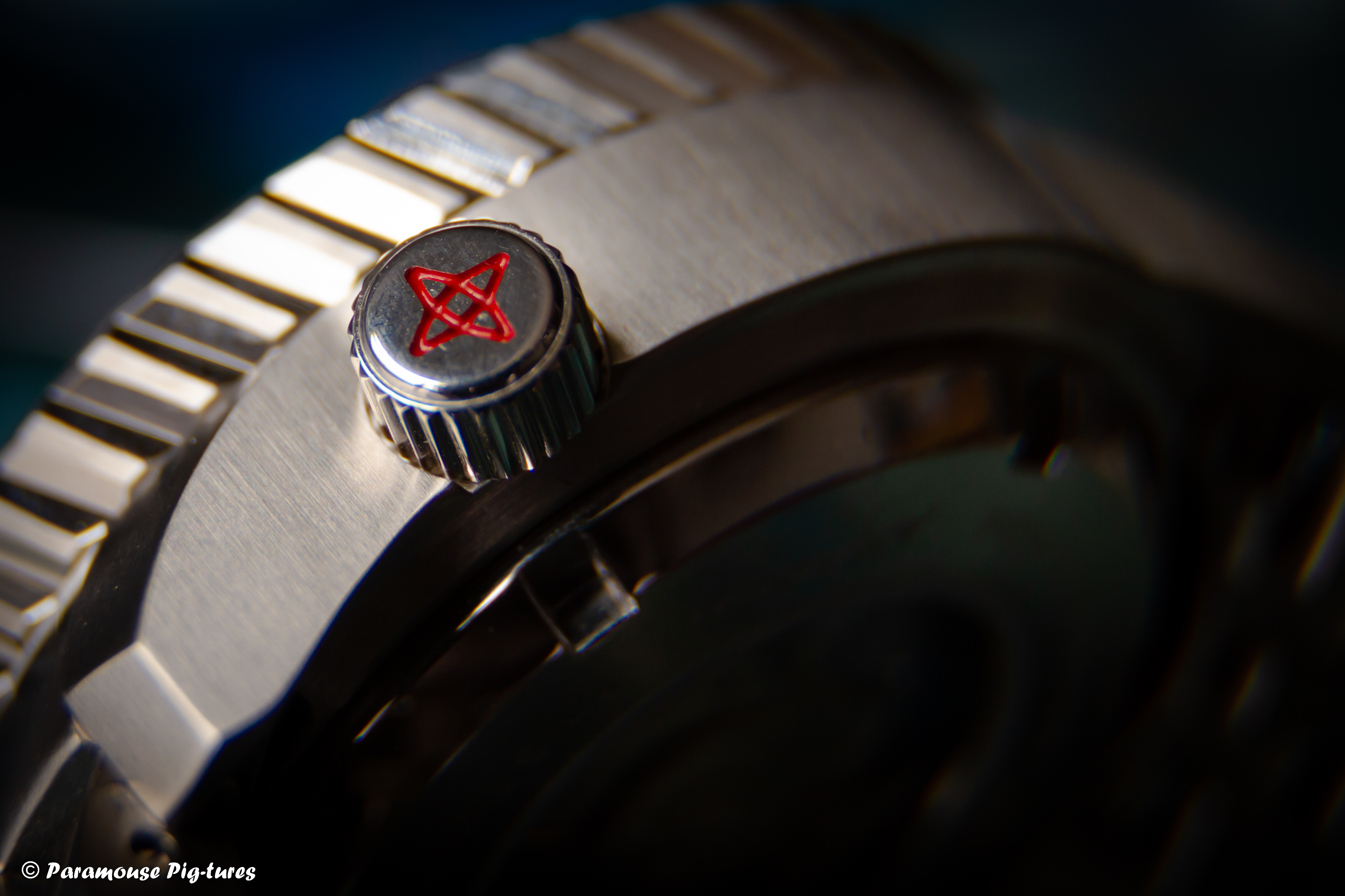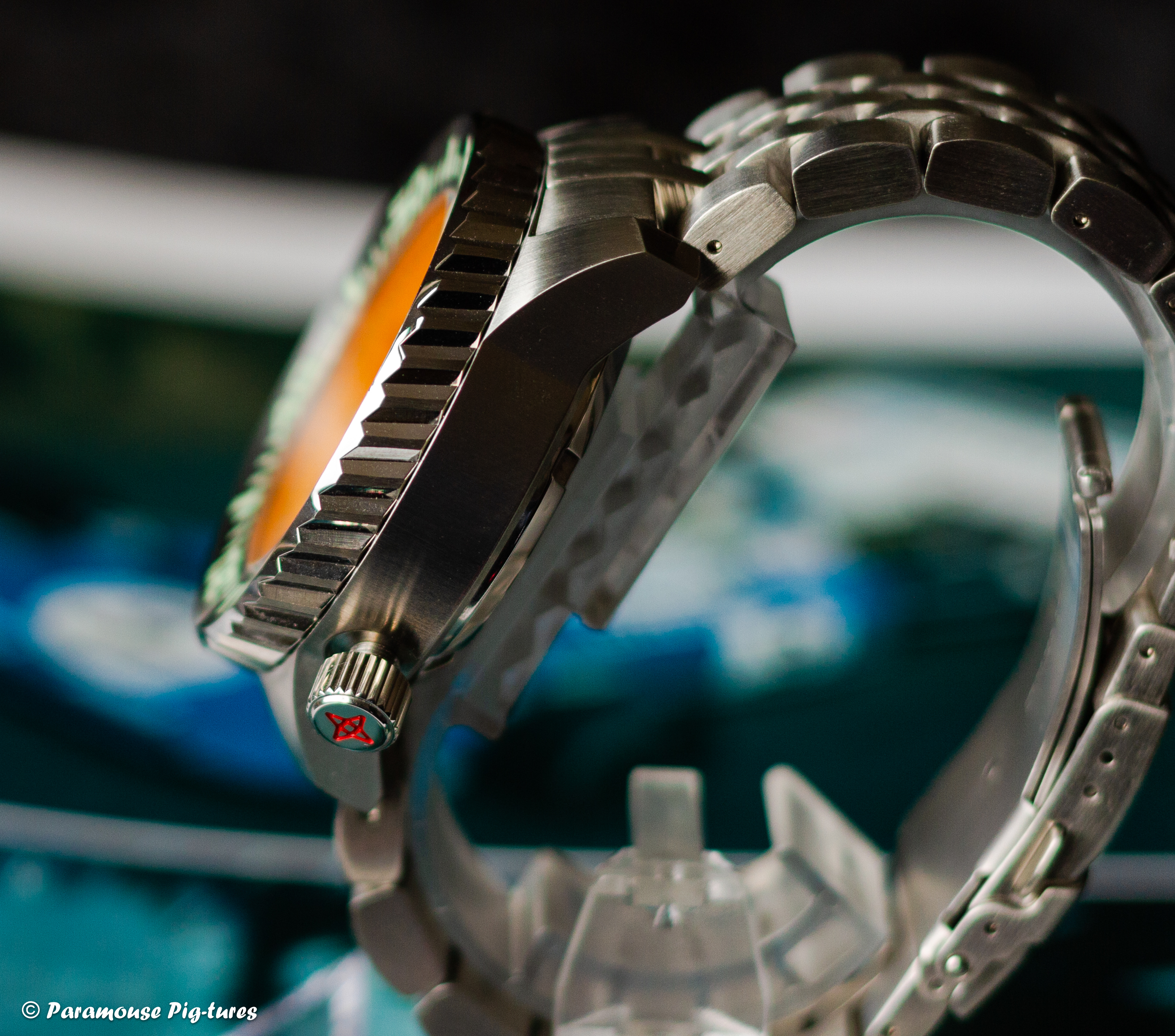 Letztere ist wirklich sehenswert. Eine so spielfrei montierte Lünette habe ich schon ewig nicht mehr gesehen. Der Widerstand beim Drehen ist meiner Ansicht nach genau richtig. Nicht zu leicht, damit sie sich nicht selbst verdreht, aber auch nicht zu schwer. Und das feine Klicken erinnert sofort an das satte Geräusch beim Öffnen eines schweren Safe. Die massiven Endlinks und das wirklich fette Armband passen wirklich 100%ig zu diesem schweren Stahlteil. Meckern könnte man höchstens über die etwas zu normale Schließe, die nicht so ganz zu diesem massiven Band passt, aber nichtdestotrotz tut die Schließe klaglos ihren Dienst.