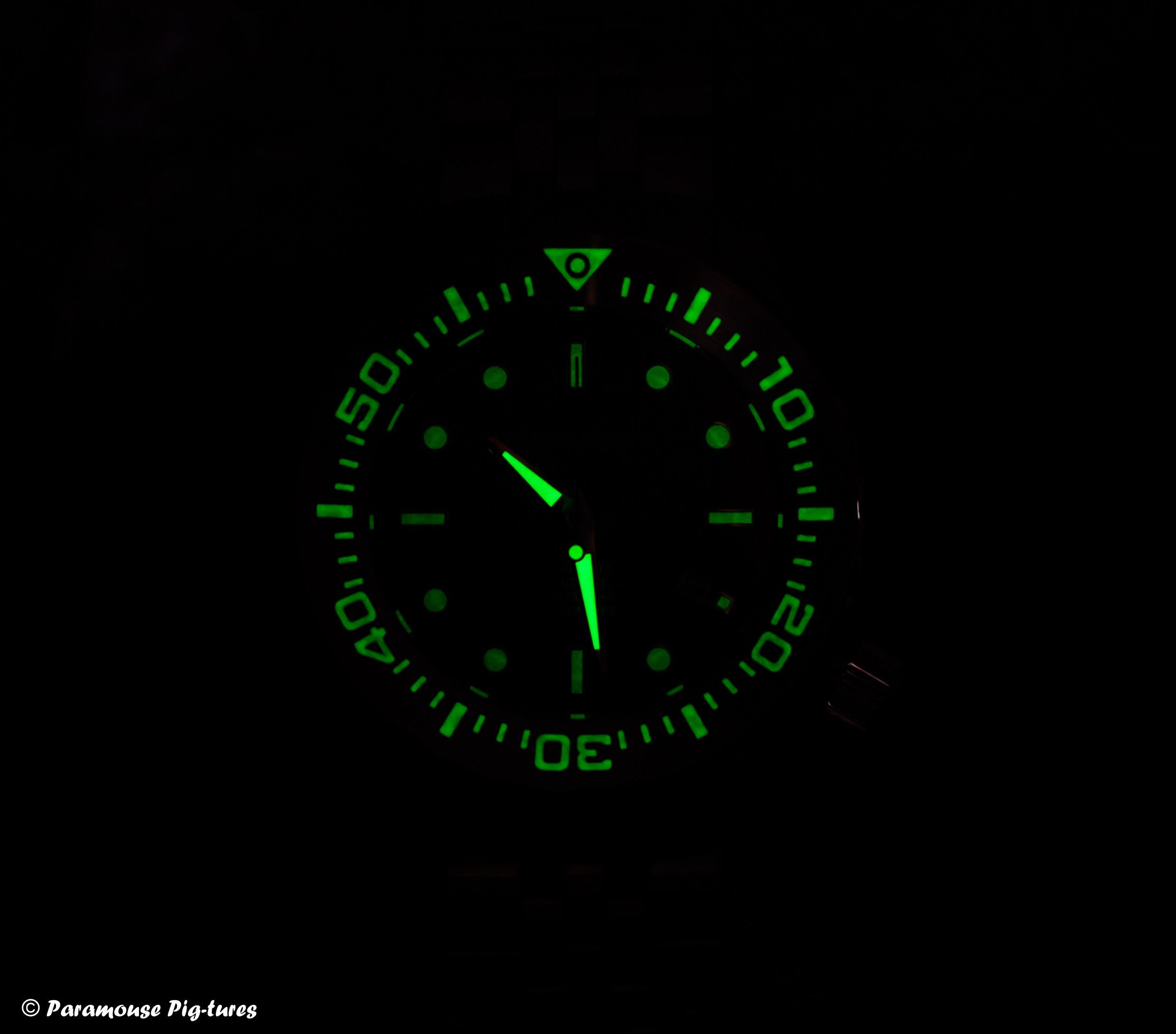 Nochmal zurück zur Lünette, denn die ist großzügig mit Lume versehen, was ihr neben dem der zahnradartigen Fräsung einen einzigartigen Look verleiht. Hier mal ein Lumeshot: