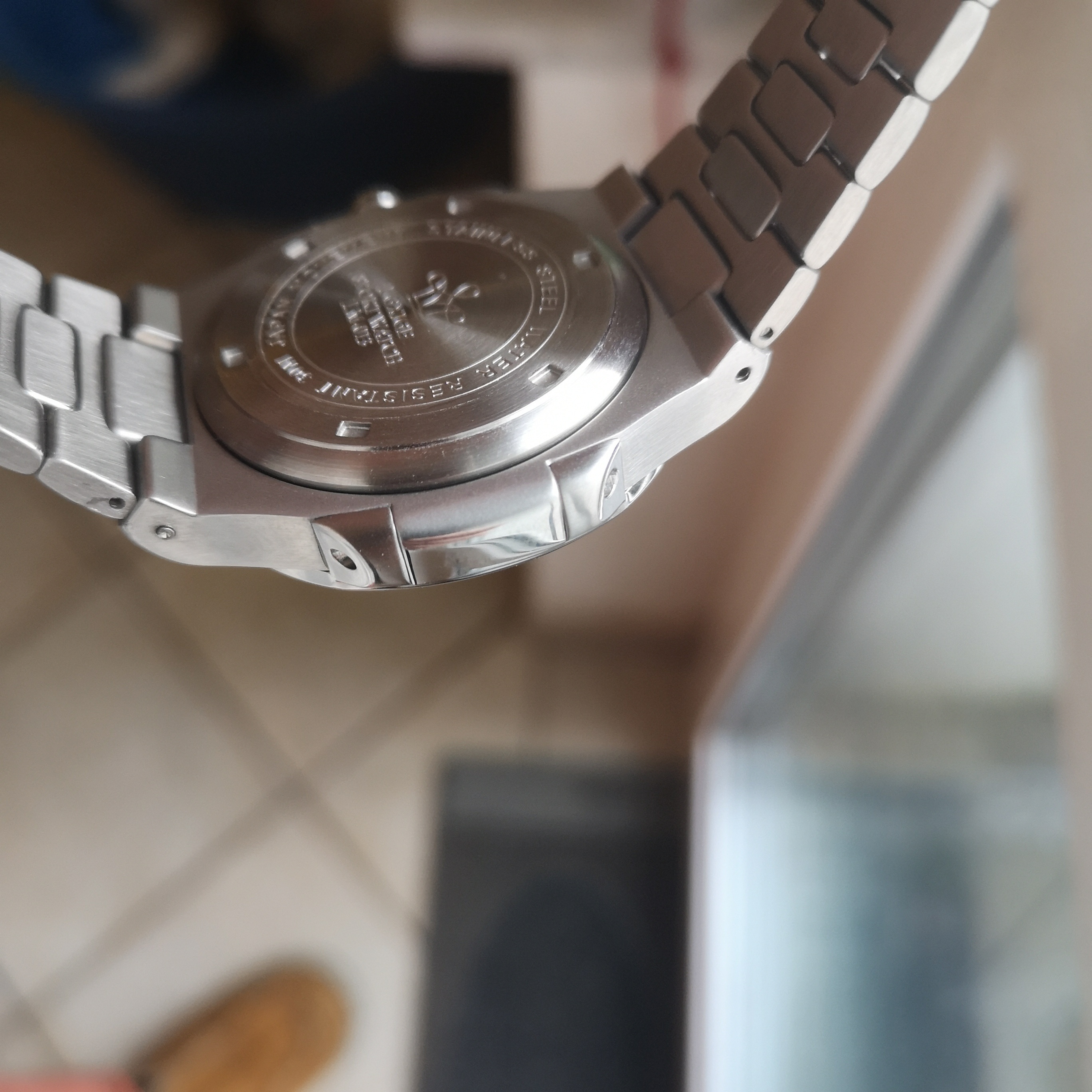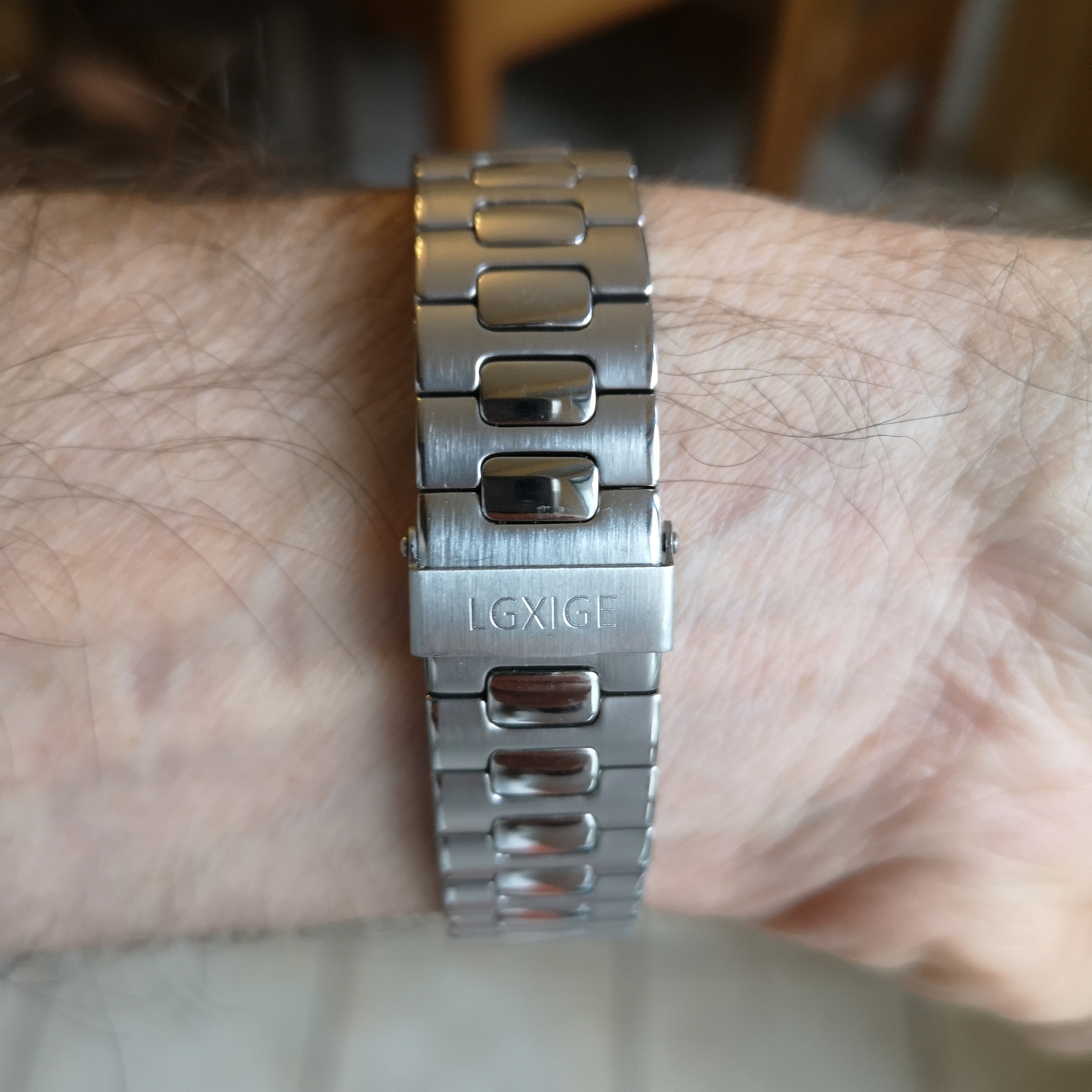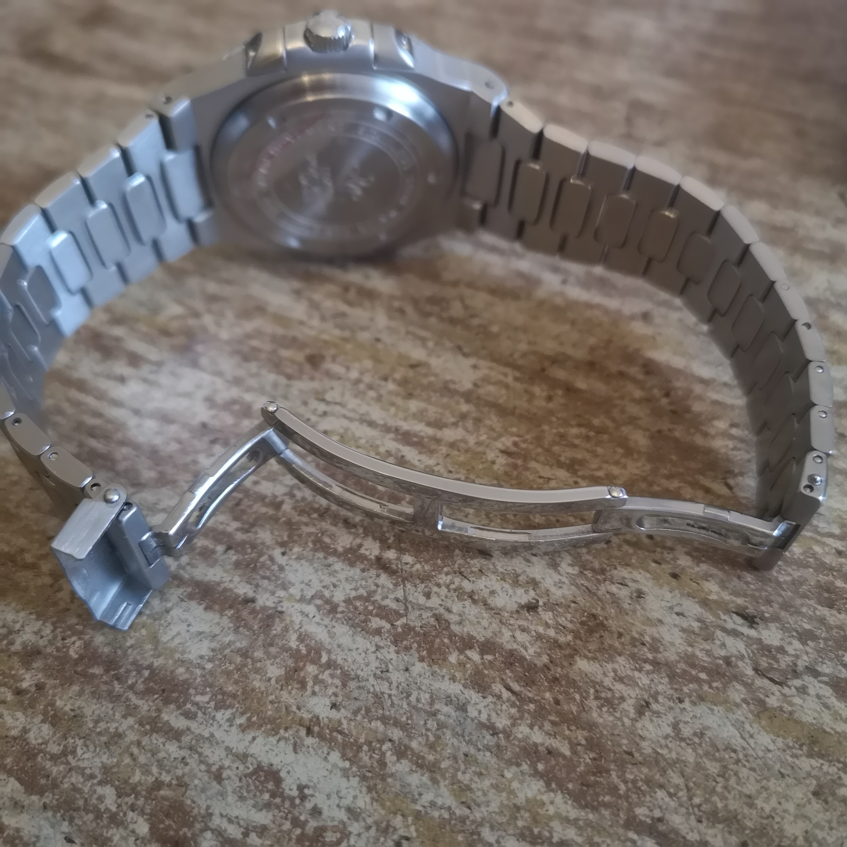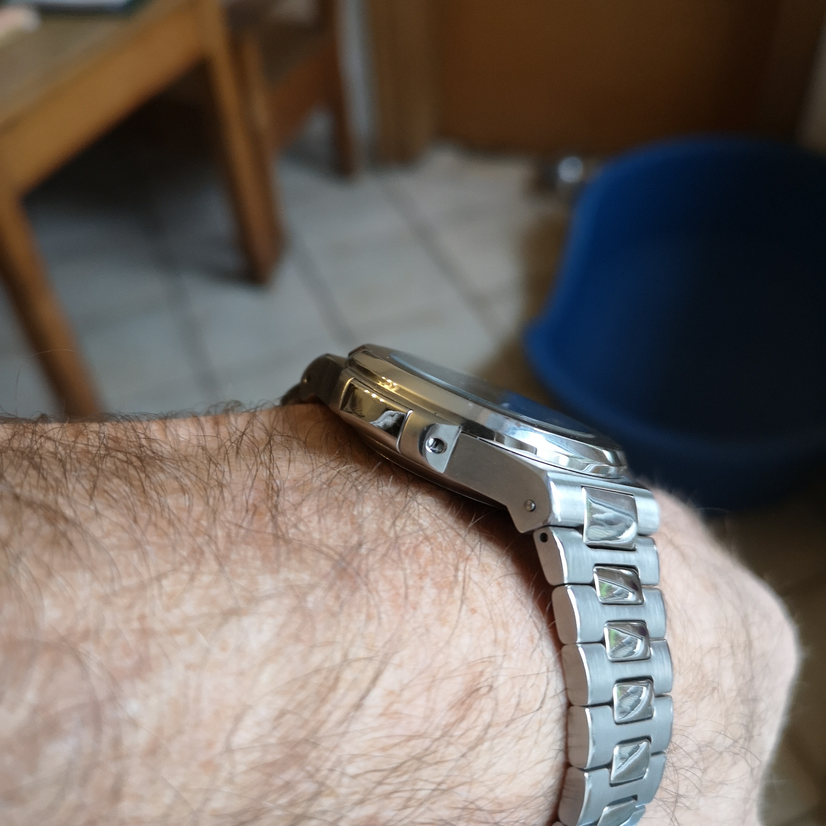 Die Uhr wiegt ca 140g - das ist für meine Arme einfach zu viel. Und dann habe ich bei Metallbändern immer das Problem die richtige Weite zu finden. Mein Arm schwillt sehr schnell an wenn es warm wird.