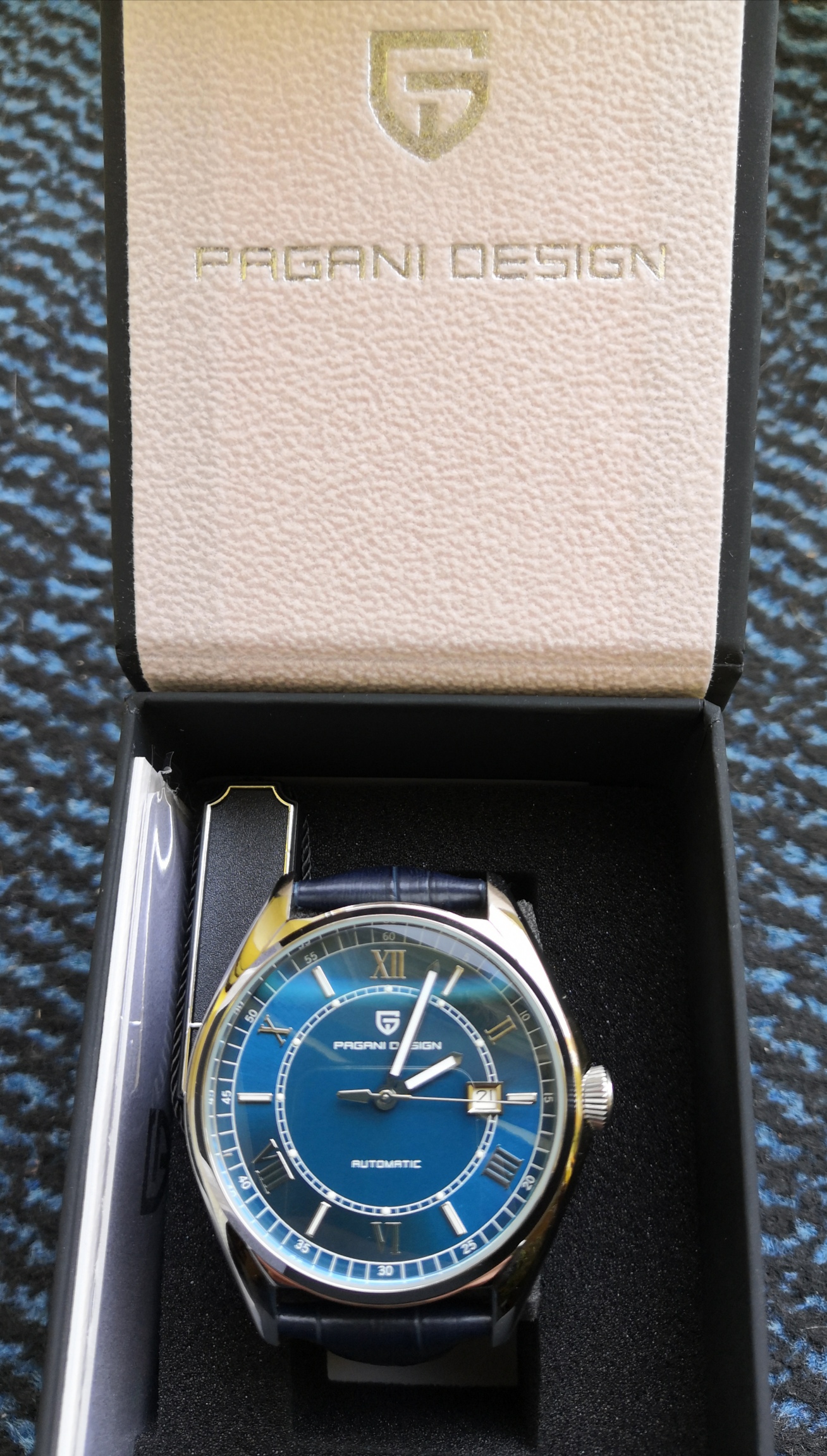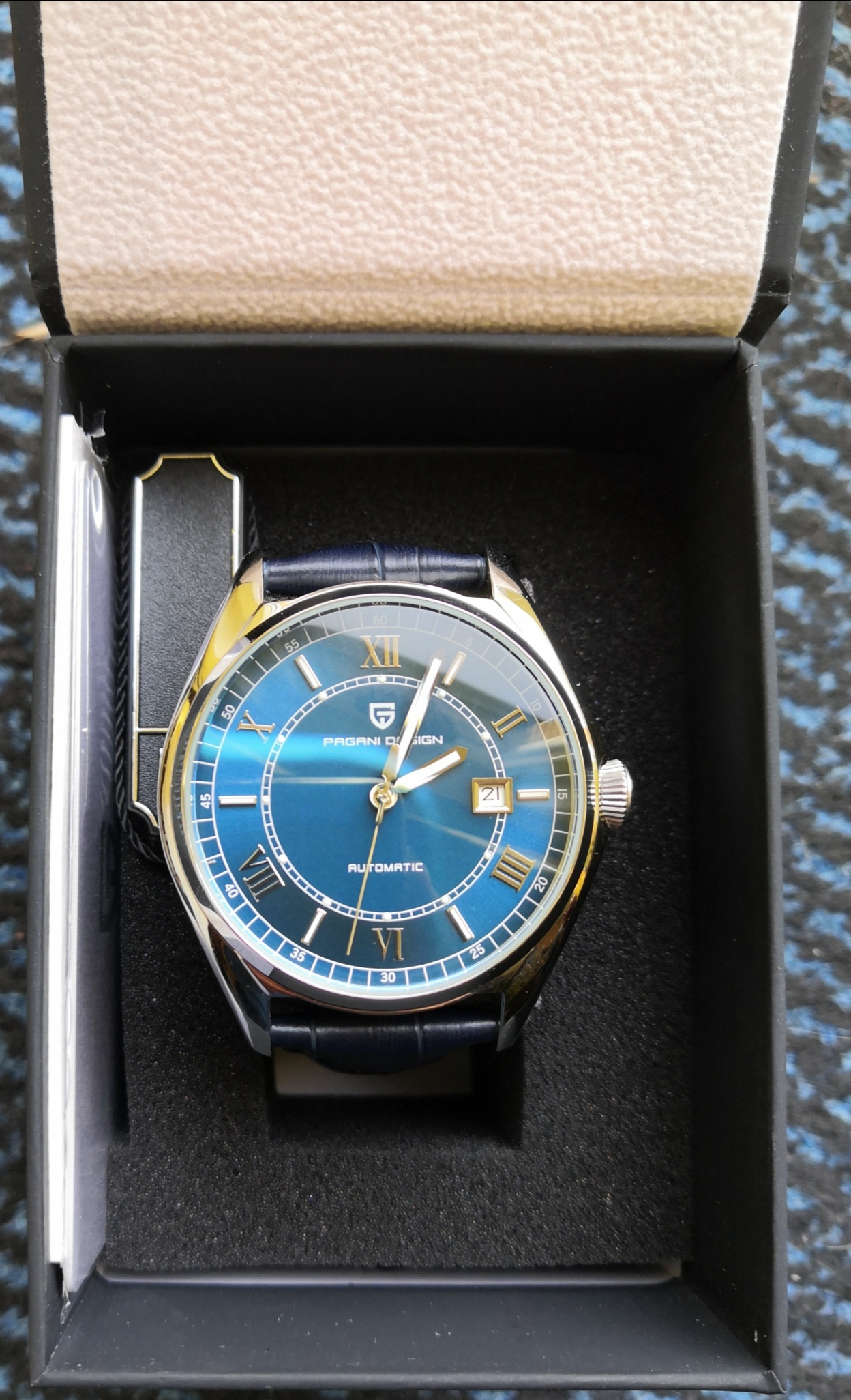 Eine gefällige Umverpackung beherbergt eine schicke, wertig und auch teurer, als sie tatsächlich ist, wirkende Automatikuhr mit schimmerndem, blauen Zifferblatt und farblich abgestimmtem, dunkelblauem Lederband mit 22 mm breitem Bandanstoß und Butterfly-Faltschließe.