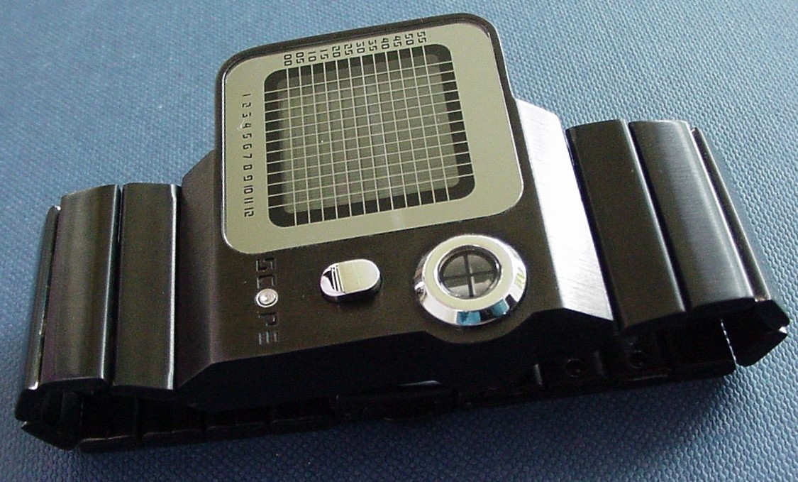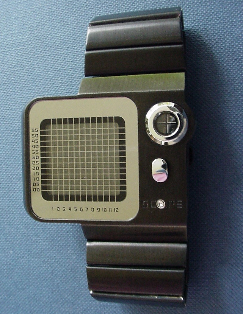 Leider sind die Uhren immer nur wenige Jahre (oder sogar nur Monate) im Angebot und so wechselt die Kollektion ständig. Manche Modelle erreichen einen gewissen Kultstatus und verkaufen sich offenbar gut, aber auch die verschwinden. Dass eine ausverkaufte Uhr später wieder neu aufgelegt wurde, habe ich nie gesehen.Eine der bekanntesten Tokyoflash-Uhren und meine Lieblingsuhr aus dieser Quelle ist die «Scope», die ich hier vorstelle. Es ist auch die einzige, die ich besitze, und zwar erst seit ein paar Tagen.Die Scope erschien spätestens 2006, aus diesem Jahr stammen die ältesten Erwähnungen im Netz. Spätestens 2010 erschien ein Nachfolgemodell Scope 2, das sich aber im Aussehen und der Anzeigeart von der ursprünglichen Scope stark unterscheidet.