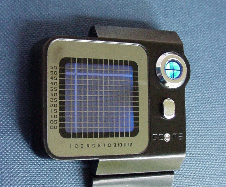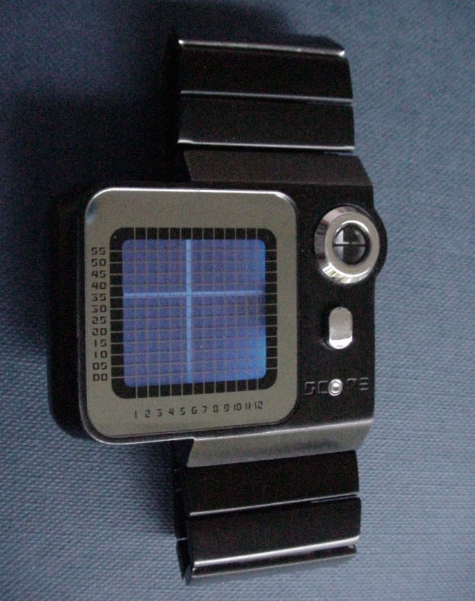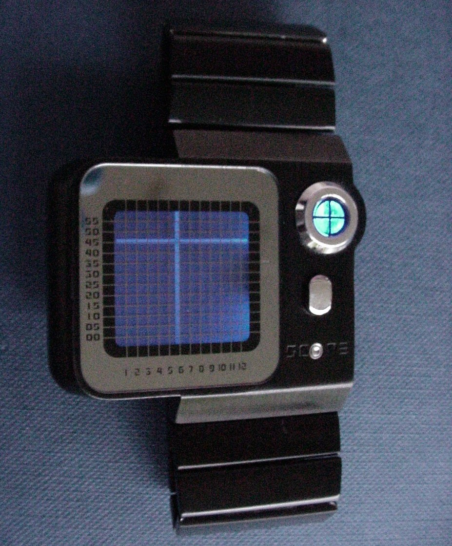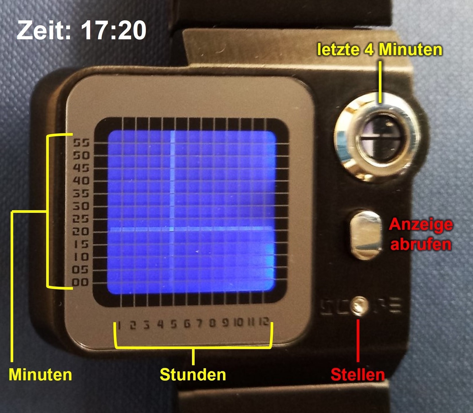 Da es ja eine LED-Uhr ist, ist die Anzeige nicht permanent, sondern erscheint nur auf Knopfdruck und erlischt wieder nach ein paar Augenblicken. Zum Abrufen der Anzeige gibt es den grossen silberfarbenen Drücker auf der Uhr-Vorderseite. Der kleine versenkte Drücker im 'O' des eingeprägt Logos 'SCOPE', der mit einem spitzen Werkzeug, z.B. einem Zahnstocher bedient werden muss, dient zum Stellen. Hat man den einmal gedrückt, blinkt die senkrechte Stundenlinie, die zunächst bei Stunde 1 steht. Mit jedem Drücken des grossen Drückers wandert der Balken eine Position weiter nach rechts zu Stunde 2, dann 3, usw.Drückt man wieder den kleinen versenkten Drücker, blinkt nun die waagrechte Minutenlinie, zunächst auf Position 00. Die Minuten im Koordinatengitter werden ja in einem 5-Minuten-Raster angezeigt, nach Minute 00 kommt Minute 05. So wäre eine Minute genauer Zeitanzeige also nicht möglich. Deshalb gibt es rechts oben noch das silberfarben und erhöht eingefasst 'Bullauge', das in vier Quadranten eingeteilt ist und die Minuten 1 bis 4 anzeigt. Drückt man im Stellmodus den grossen Drücker, leuchtet zunächst der linke obere Quadrant (01), beim zweiten Drücken der linke untere (02), dann der rechte obere (03) und schließlich leuchten alle 4 (04). Erst beim fünften Drücken wandert die Minutenlinie eine Position weiter nach oben zu Minute 05, gleichzeitig erlöschen alle Quadranten des Bullauges.