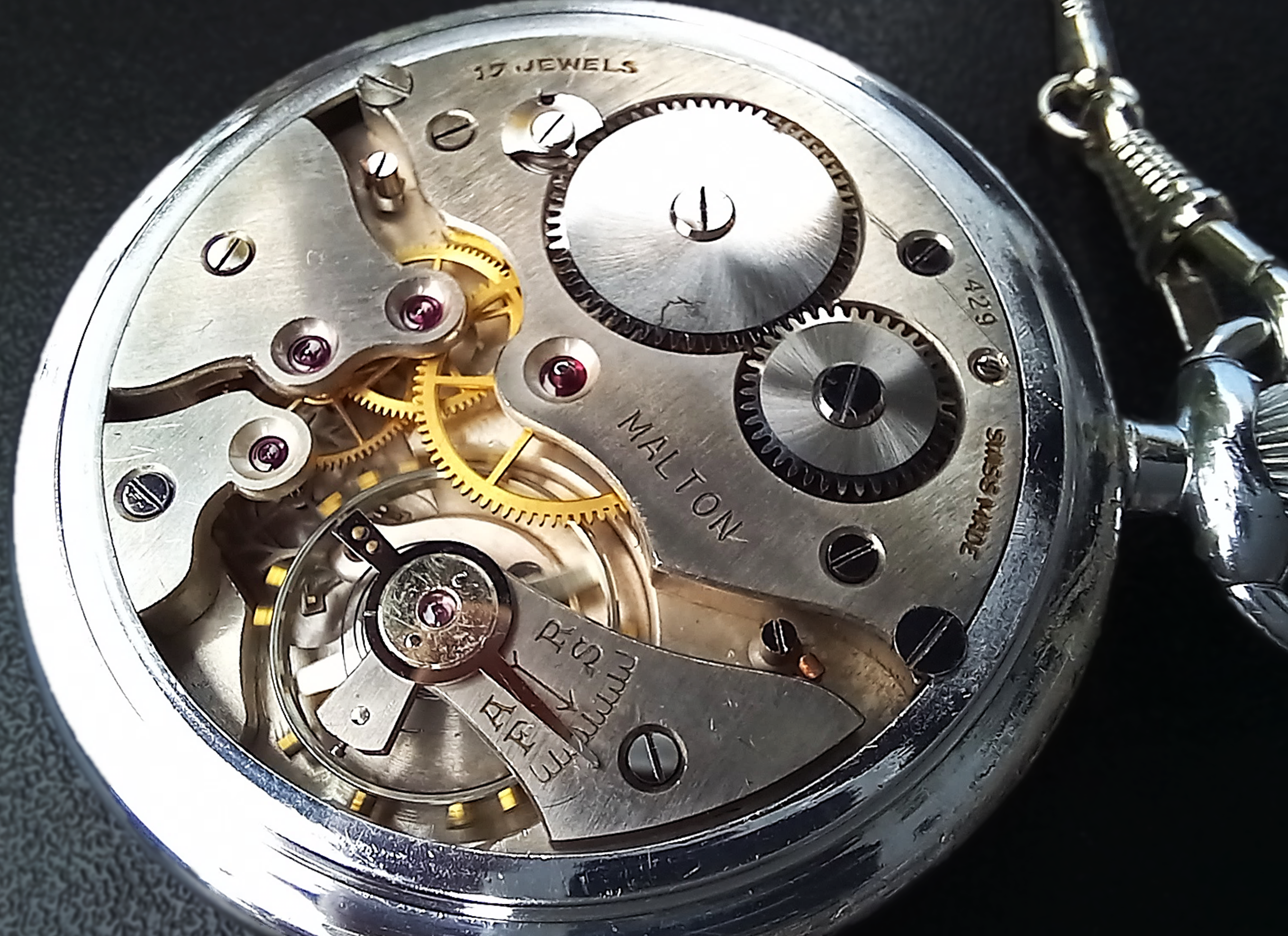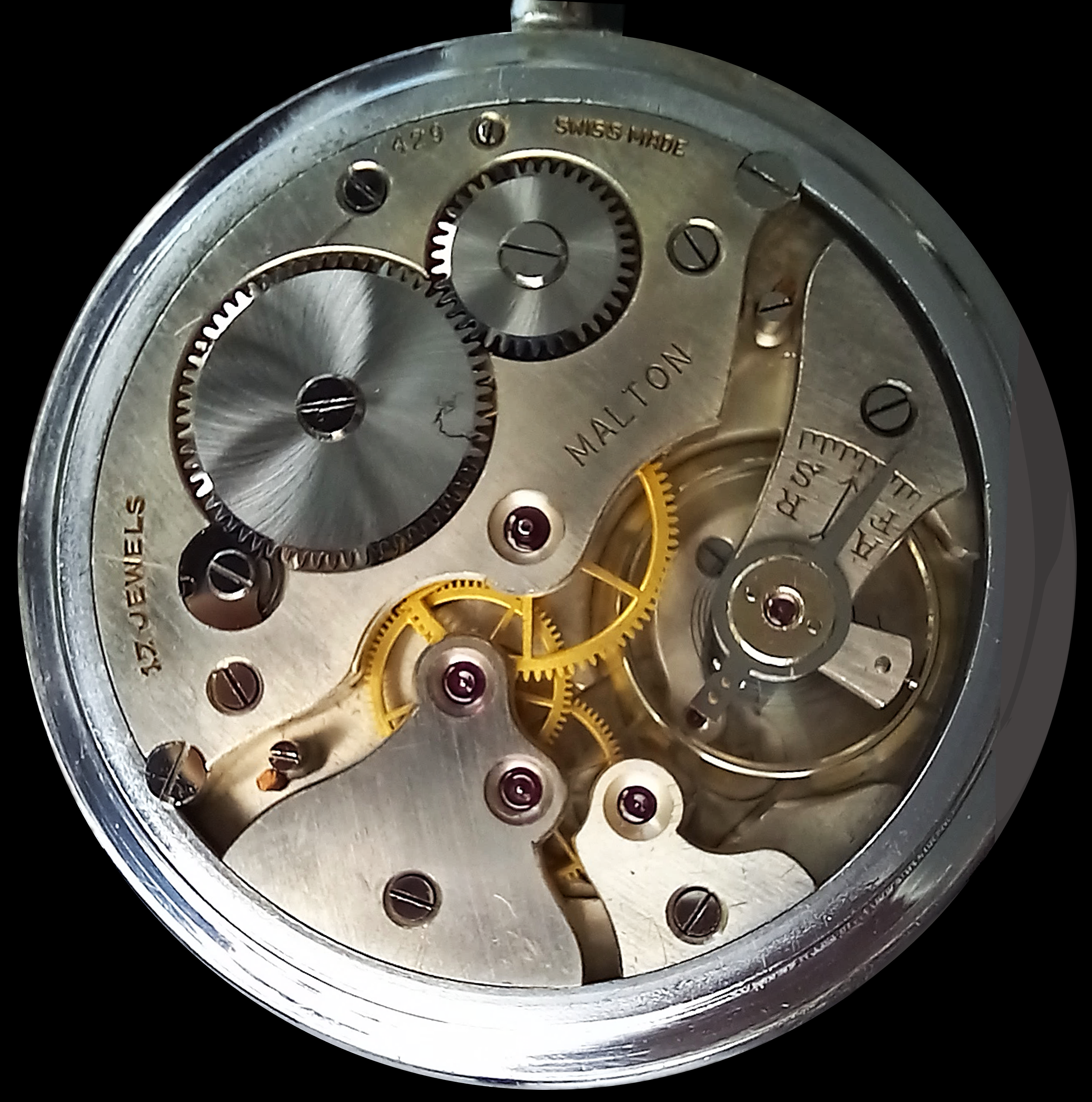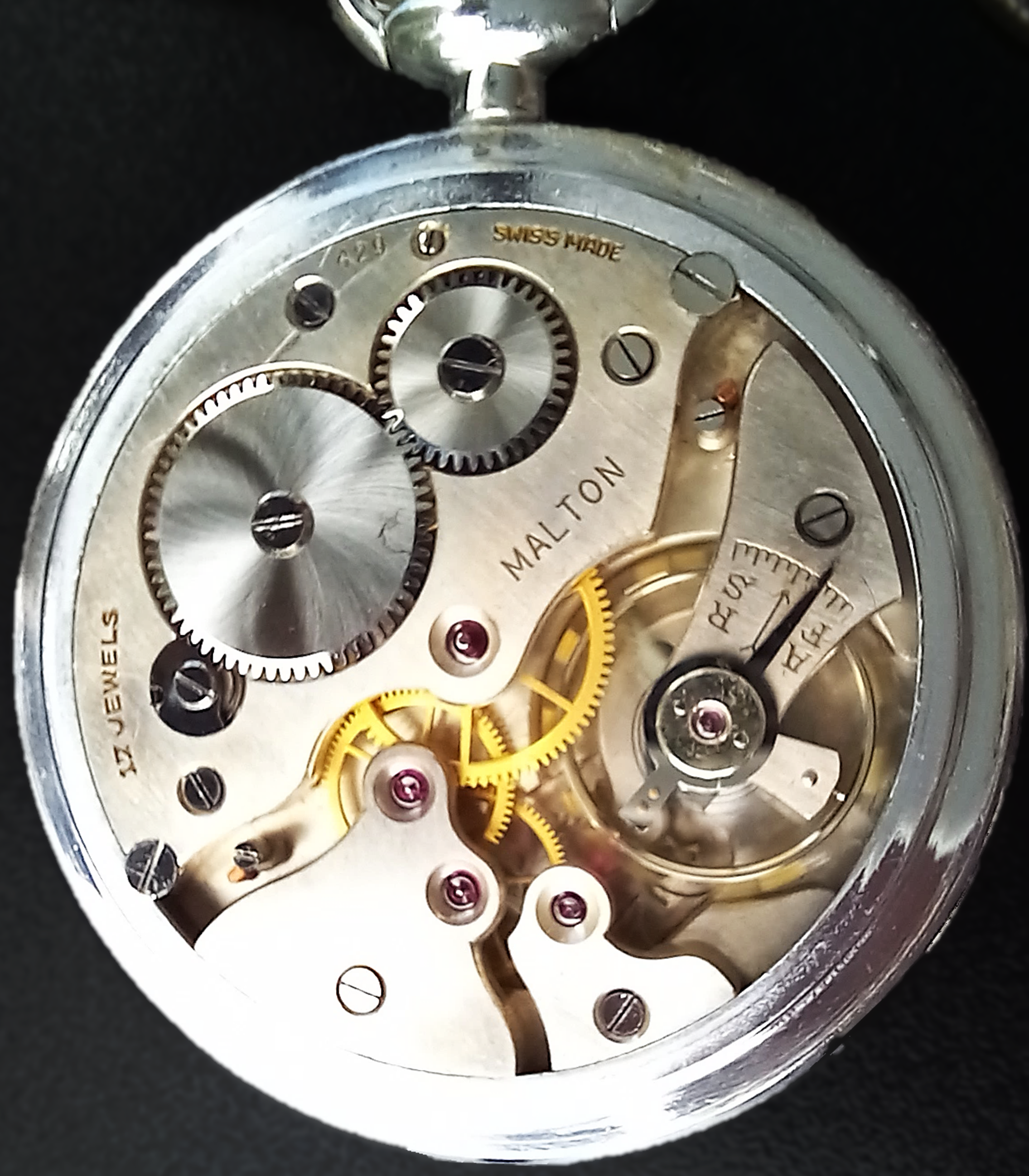 Ich habe bereits schon mindestes 3 «Malton»-Taschenuhren gesehen, die baugleich mit meiner waren, d.h. das gleiche Werk, Zifferblatt und Zeiger. Aber immer war das Werk in einem anderen Gehäuse, diese waren aus den USA oder Kanada. Aus der Schweiz wurden also die Uhren ohne Gehäuse exportiert und nachträglich in verschiedene Gehäuse eingeschalt. Dies war nicht unüblich. In den USA konnte man vielfach Werke und Gehäuse beim Uhrenkauf frei kombinieren.