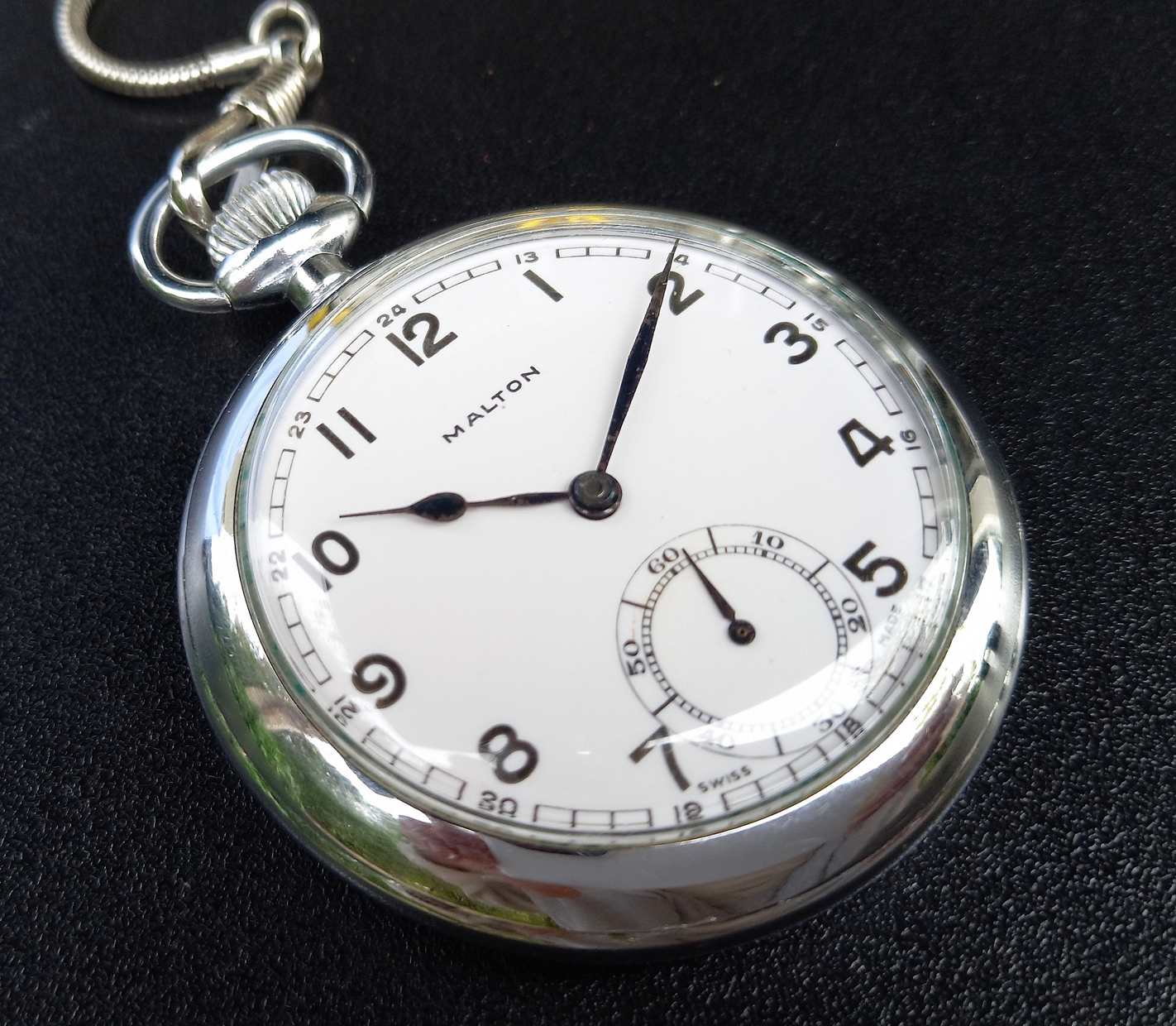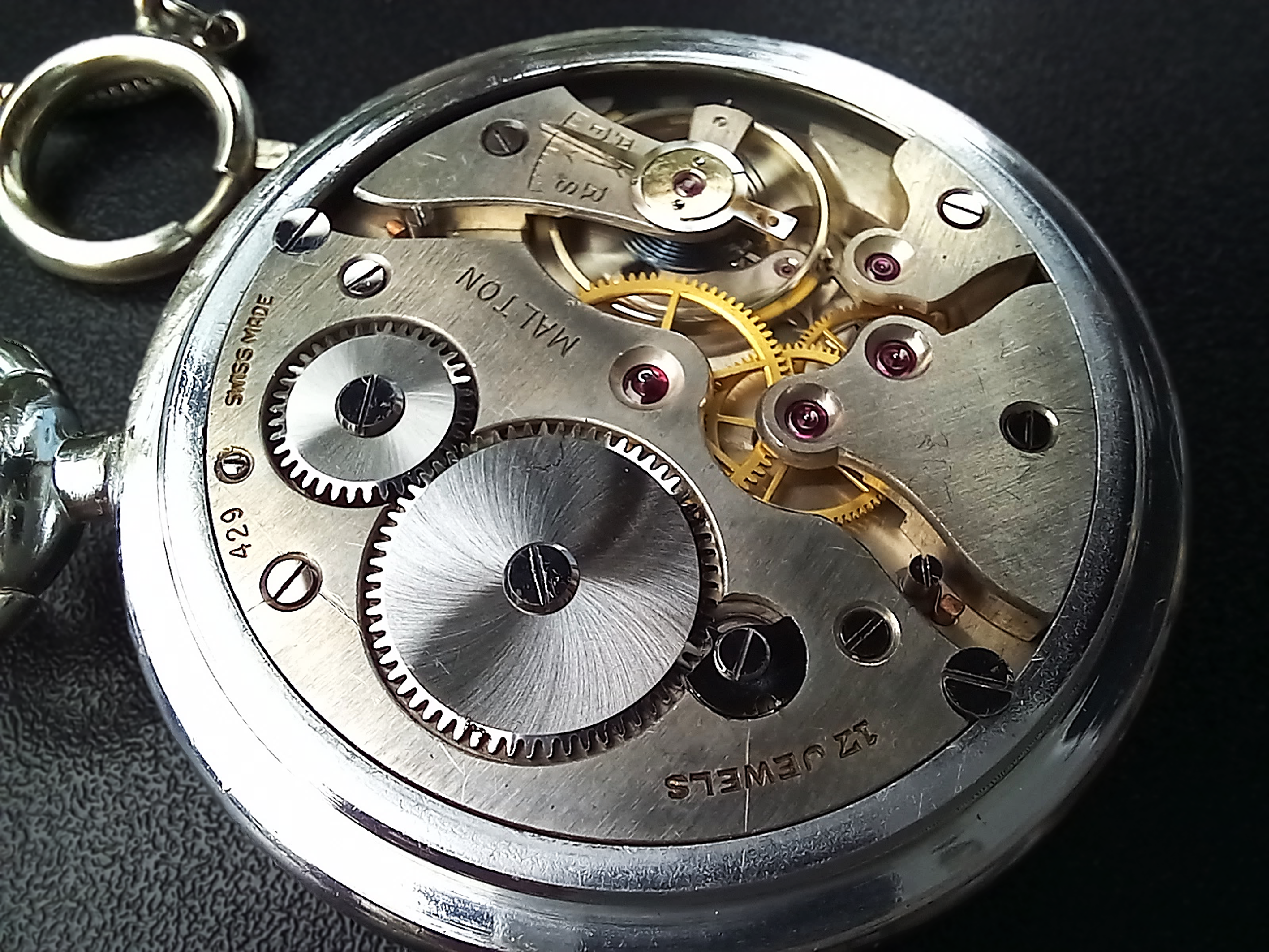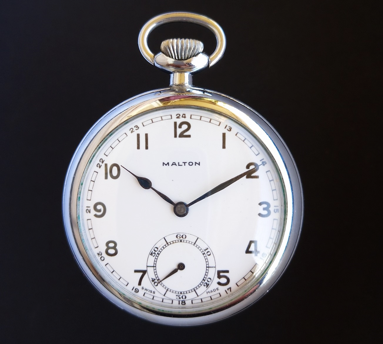 Ich habe bereits schon mindestes 3 «Malton»-Taschenuhren gesehen, die baugleich mit meiner waren, d.h. das gleiche Werk, Zifferblatt und Zeiger. Aber immer war das Werk in einem anderen Gehäuse, diese waren aus den USA oder Kanada. Aus der Schweiz wurden also die Uhren ohne Gehäuse exportiert und nachträglich in verschiedene Gehäuse eingeschalt. Dies war nicht unüblich. In den USA konnte man vielfach Werke und Gehäuse beim Uhrenkauf frei kombinieren.