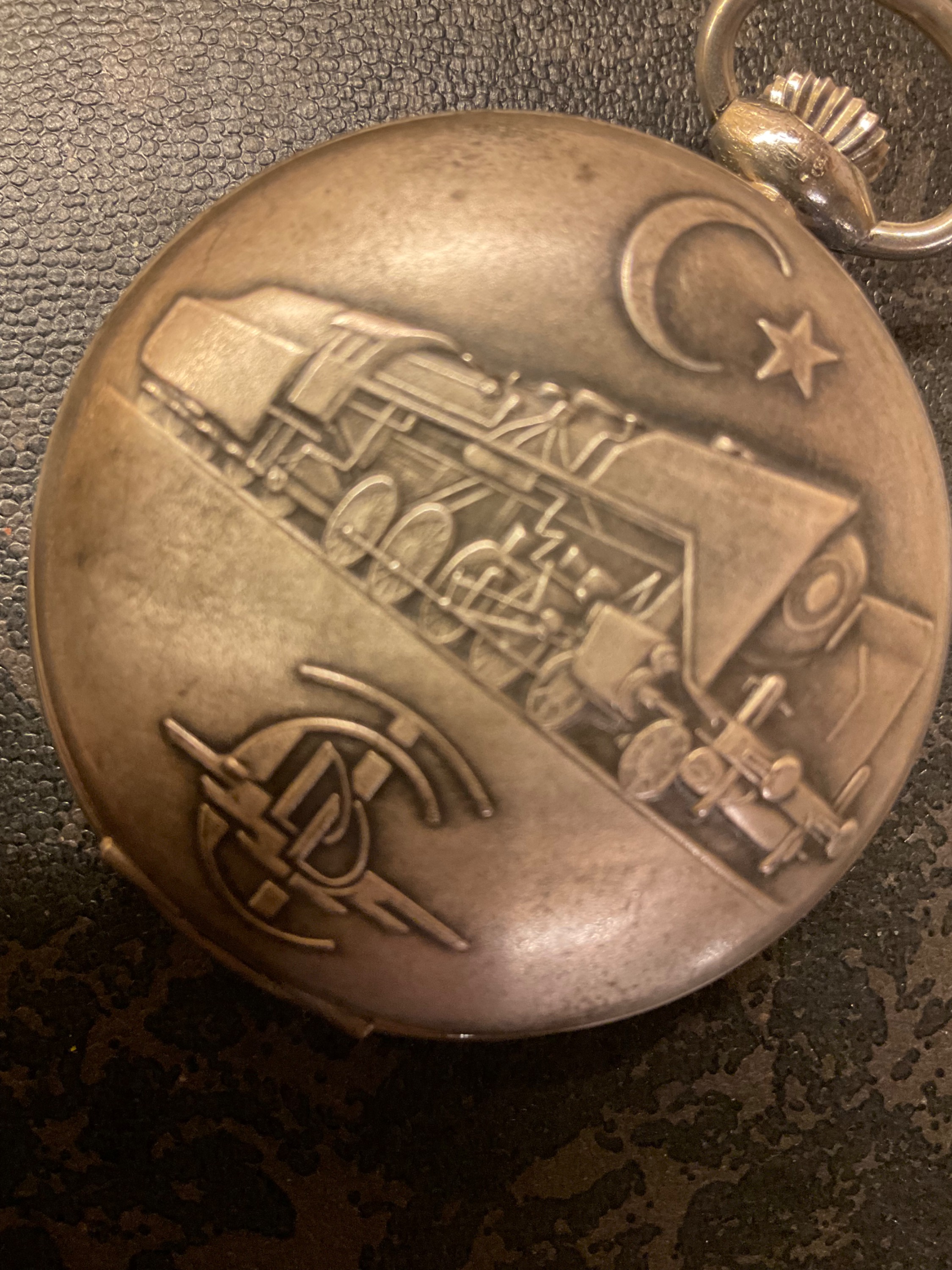 Für jedes durchreisende Land und die hiermit Beschäftigten gab es eine Ausgabe mit den National-Symbolen, im Bild Halbmond und Stern, für Türkei. Außerdem wurden die Antriebsloks öfters gewechselt. Die beteiligten Staatsbahnen setzten jeweils ihre modernsten Maschinen ein! Ich erhielt die Uhr von einen befreundeten sehr alten Herrn, einen Ungar, dessen Vater selbst noch Lokführer war, der wiederum auf der „424“ fuhr, u.a. auch für den Orientexpress. Die ungarische Lok war zur Herstellungszeit (20er Jahre) eine Sensation mit ihrer Achsfolge und den hochstehenden Kessel!