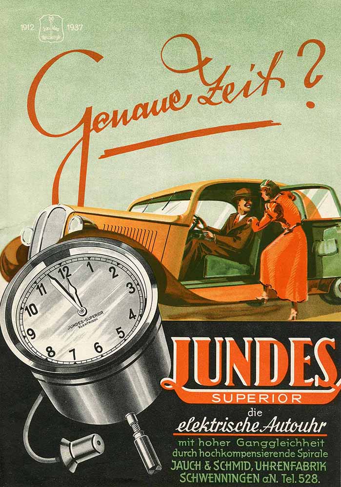 Eigentlich hatte ich etwas ganz anderes vor, aber dann hat es mir (wieder mal) das alte Werbeplakat angetan, in Verbindung mit einen Automobil, und die langwährende Tradition der Firma Jundes, Bestehen seit 1912, und ihre vielseitige (gewesene) Angebotspalette, u.a. auch Brieftaubenuhren!!