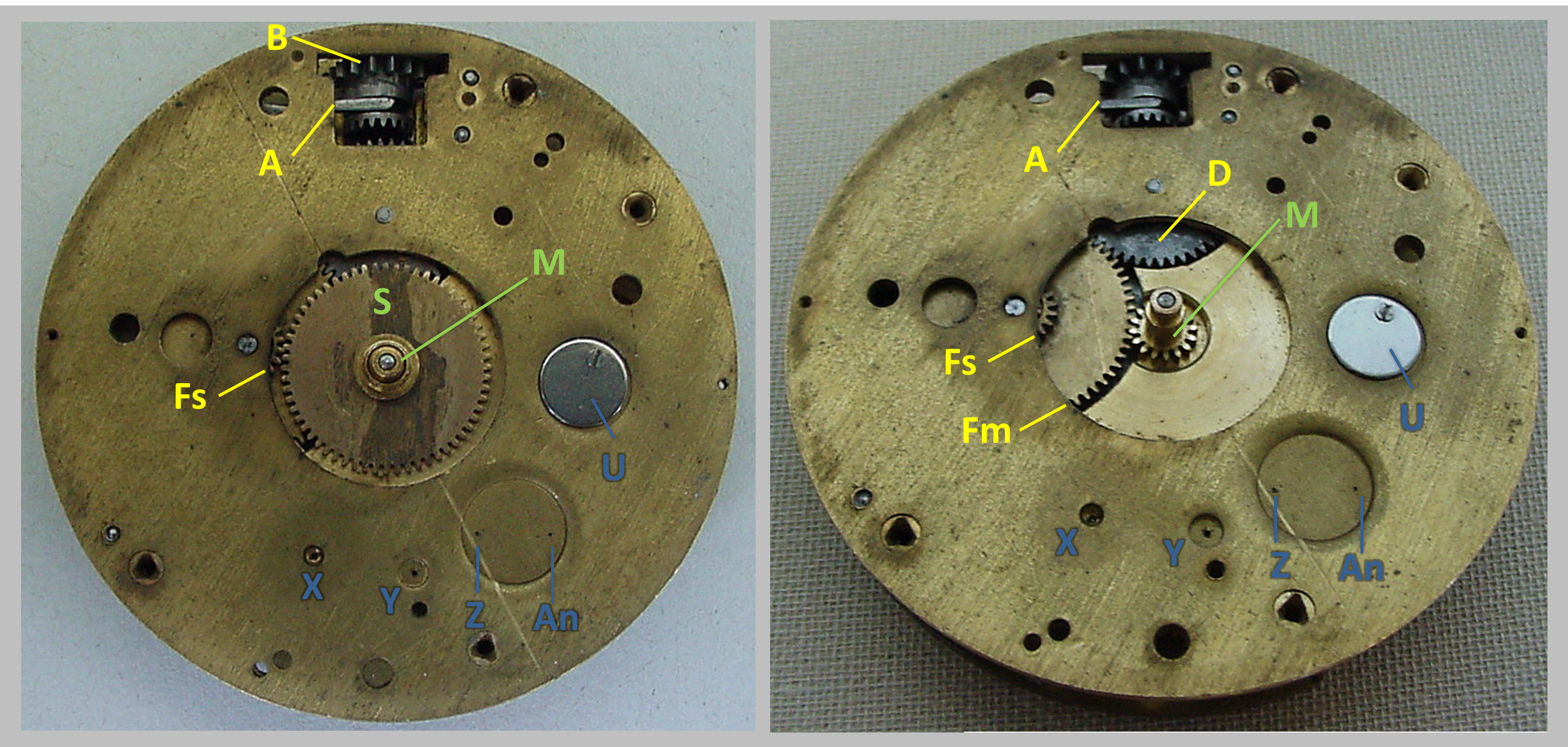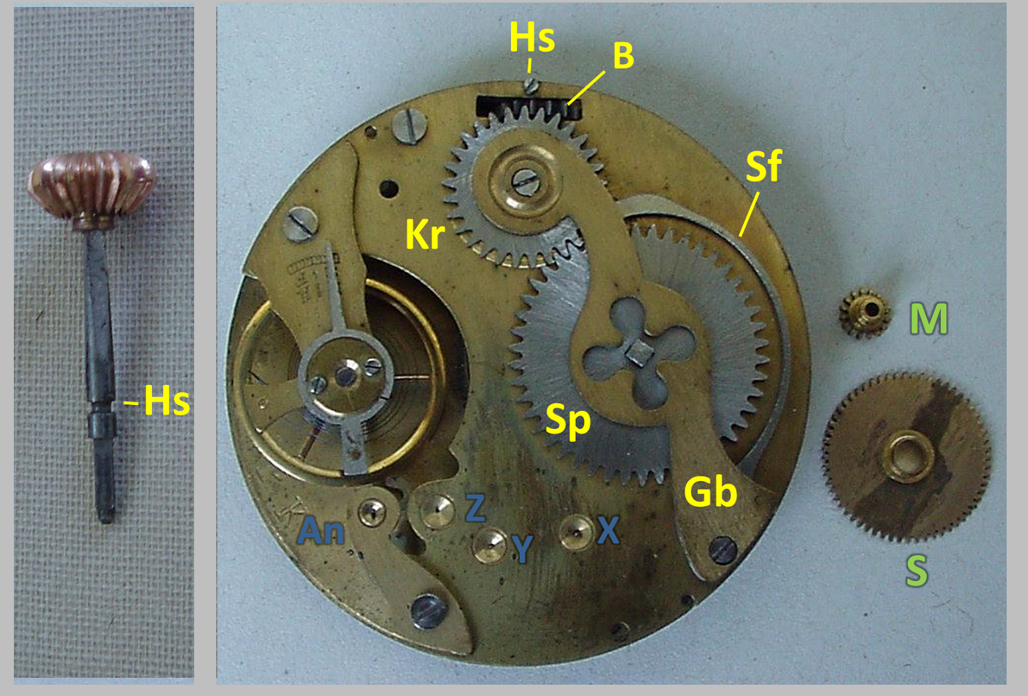 - Antrieb der Zeiger indirekt von der Seite durch ein Doppeltrieb auf dem Federhaus, Zeigerreibung zwischen dem Federhaus und diesem Doppeltrieb. Kein zentrales Rad im Werk, das grosse Federhaus geht über die Werksmitte. Das Minuten- und das Stundenrohr sitzen locker auf einem festen Zapfen.