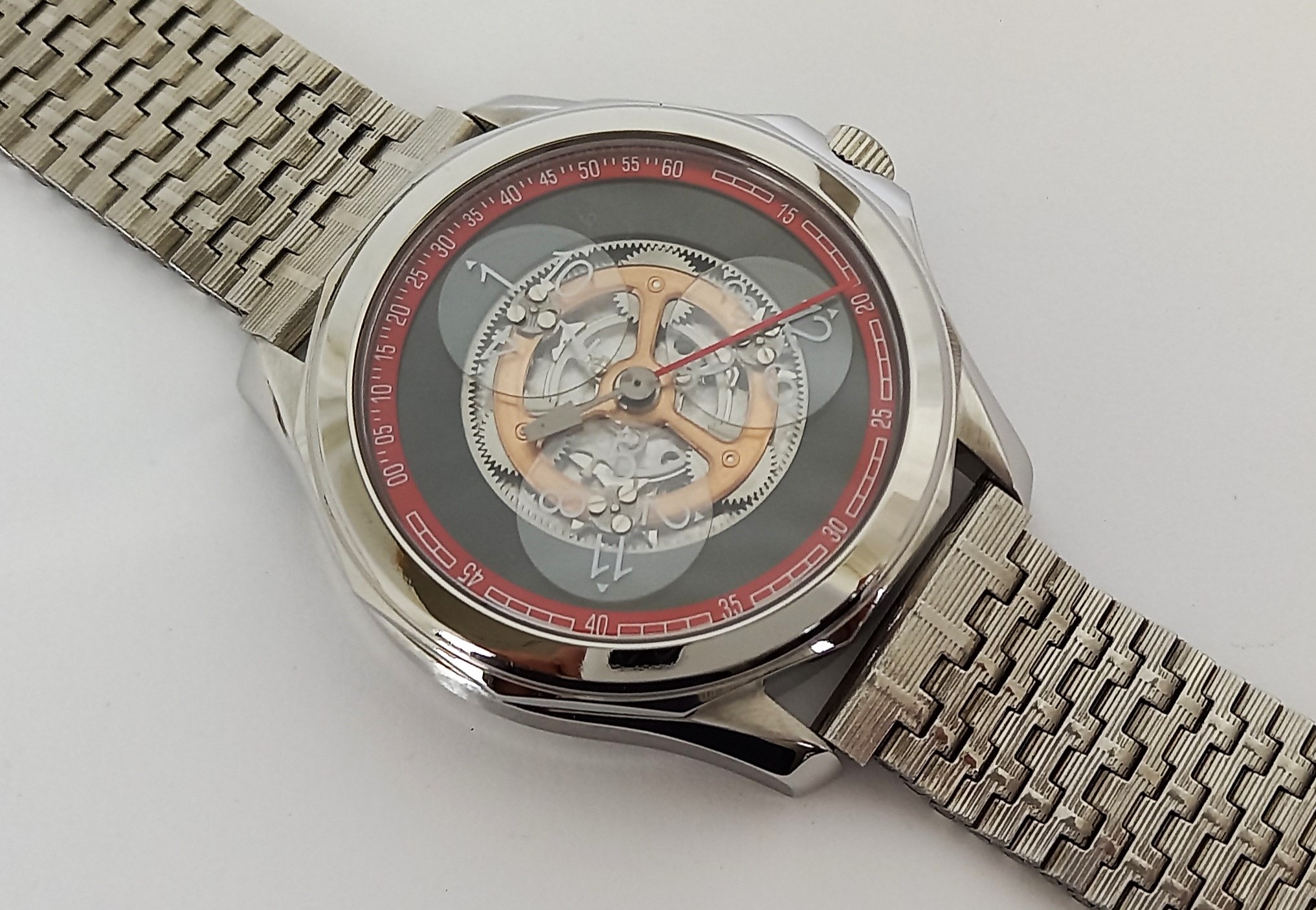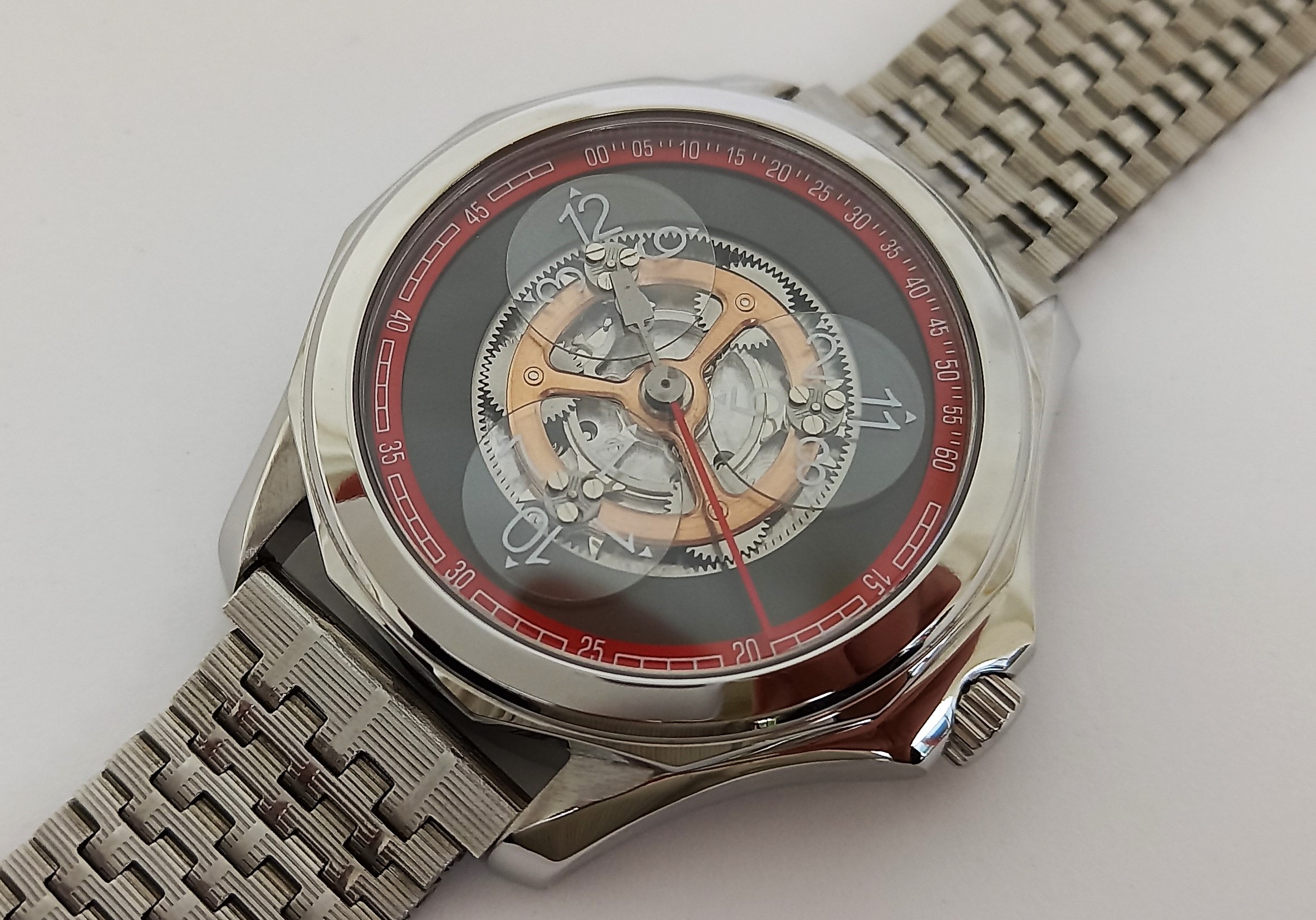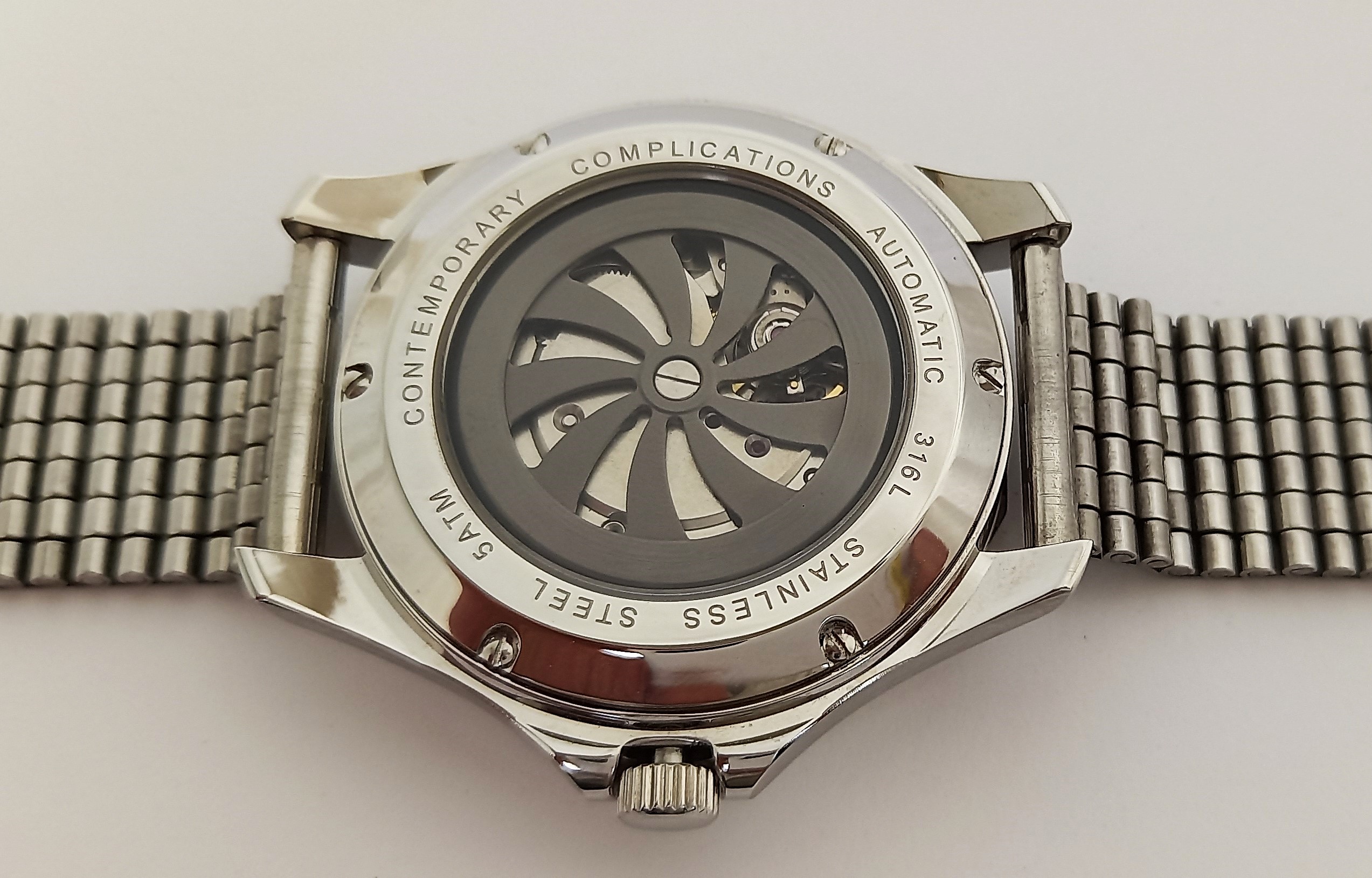 Ausserdem wurde dann noch ein Modell herausgebracht, wo die Satellitenscheiben nicht aus transparentem Saphir mit weissem Zahlendruck bestanden, sondern aus skelettierten Metallsatelliten mit Leuchtmasse. Die Satellitenscheiben leuchten also im Dunkeln, was aber deshalb eine ziemlich blöde Idee ist, weil der Chapterring mit den aufgedruckten minuten überhaupt nicht leuchtet. Man könnte also im Dunkeln die Uhr gar nicht ablesen, trotz der Leuchtmasse. Noch dazu wurde bei der ersten Serie dieser Modellvariante eine falsche, spiegelverkehrte Stunde 4 eingebaut. Wie kann so ein krasser Fehler durch alle Produktionsschritte hindurch unbemerkt bleiben? Mittlerweile wurde das aber wohl korrigiert (ich konnte aber aktuelll dieses Modell überhaupt nicht mehr auf Alibaba finden).