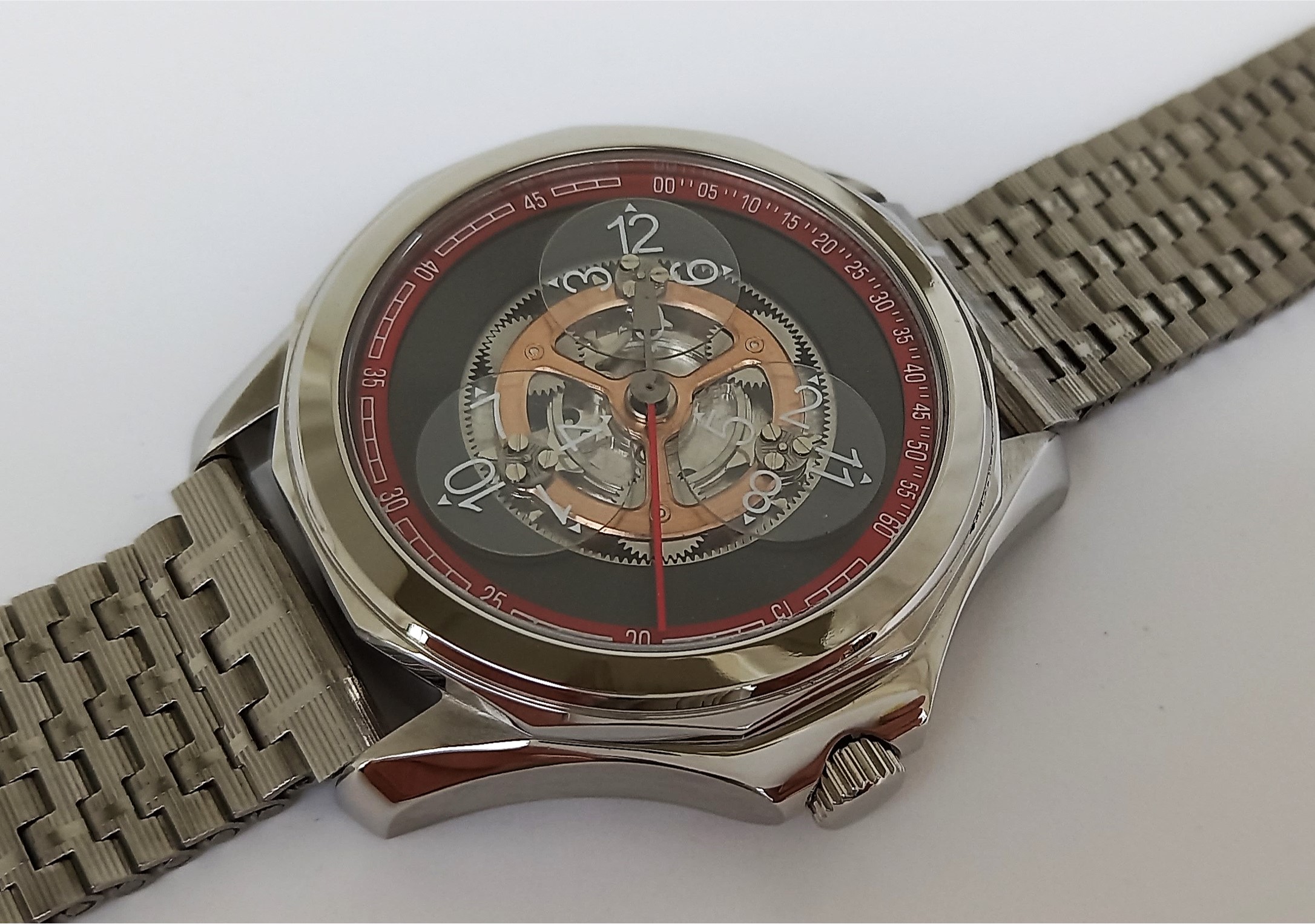 Mit der 12-eckigen Lünette, die an eine Rohrverbindung aus dem Sanitärbereich erinnert, ist das Gehäuse jedenfalls eigenständig und ahmt kein anderes, bekanntes Uhrenmodell nach.