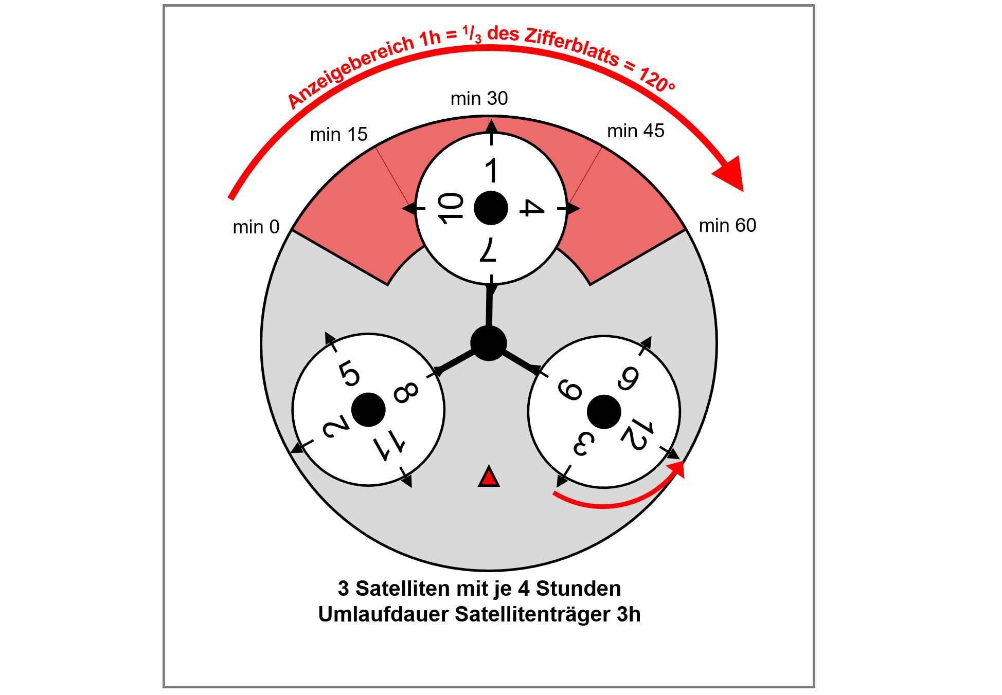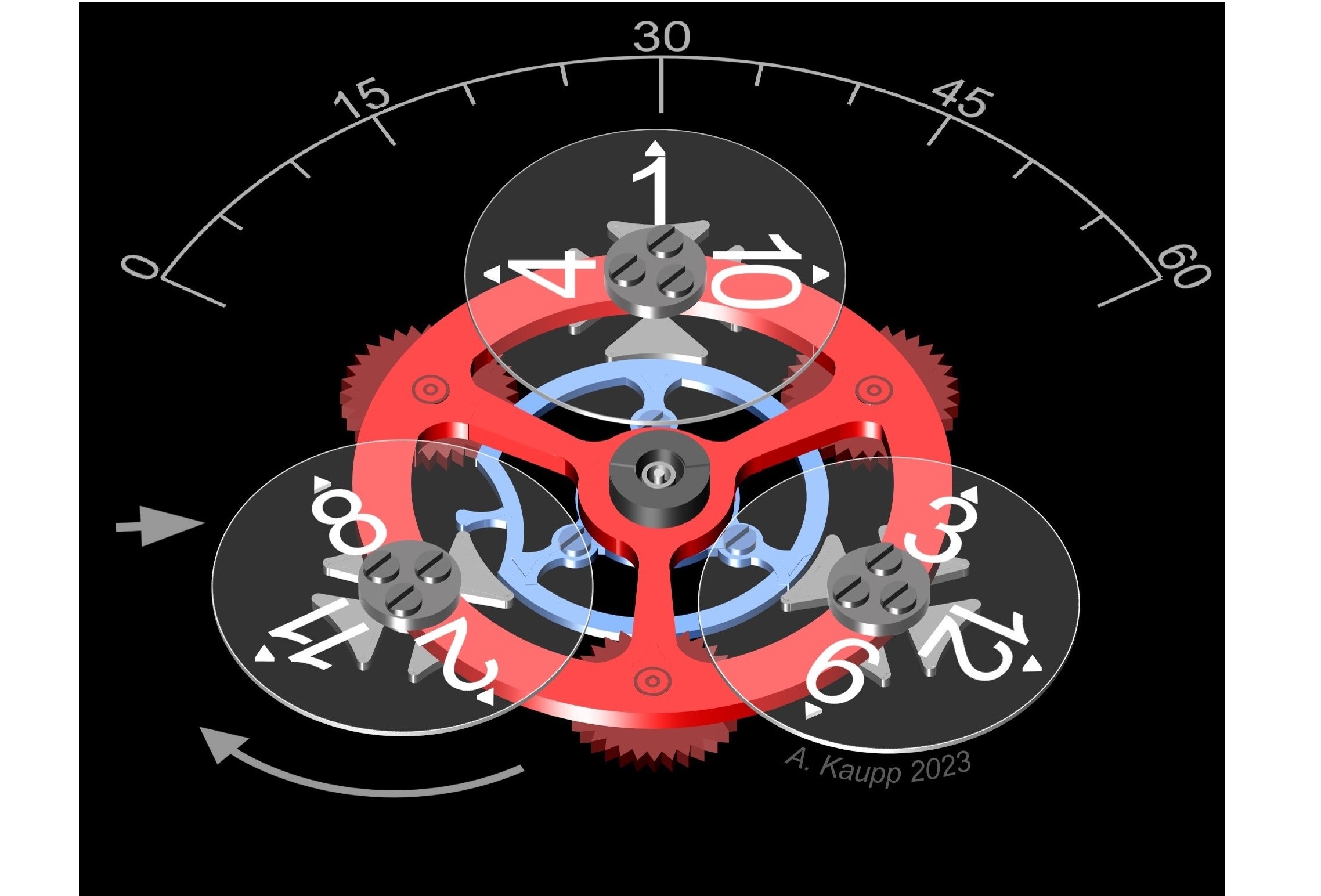 Die drei transparenten runden Satellitenscheiben mit den weiss aufgedruckten Stundenzahlen sind drehbar auf dem Satellitenträger (rot) befestigt. Auf der Unterseite hat jeder Satellit einen 4-armigen Schaltstern in der Form eines Malteserkreuzes.