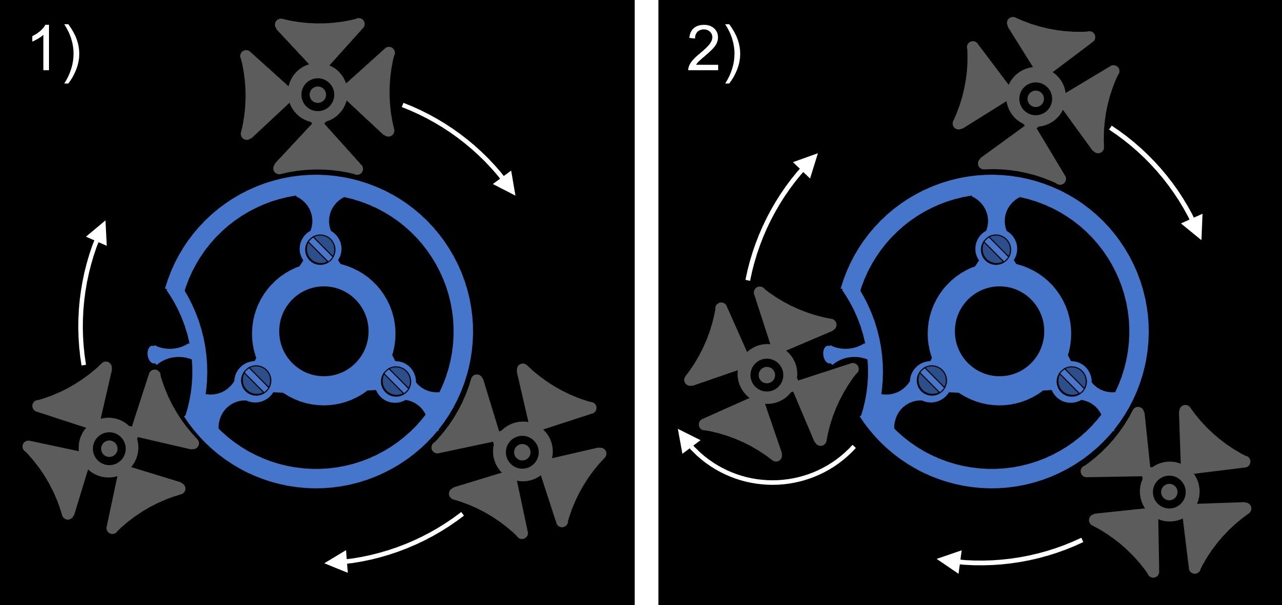 Hier noch ein Schema der malteserkreuzförmigen Schaltsterne der Satelliten (grau) und des Rings mit dem Schaltfinger (blau), um das Umschalten zu zeigen: