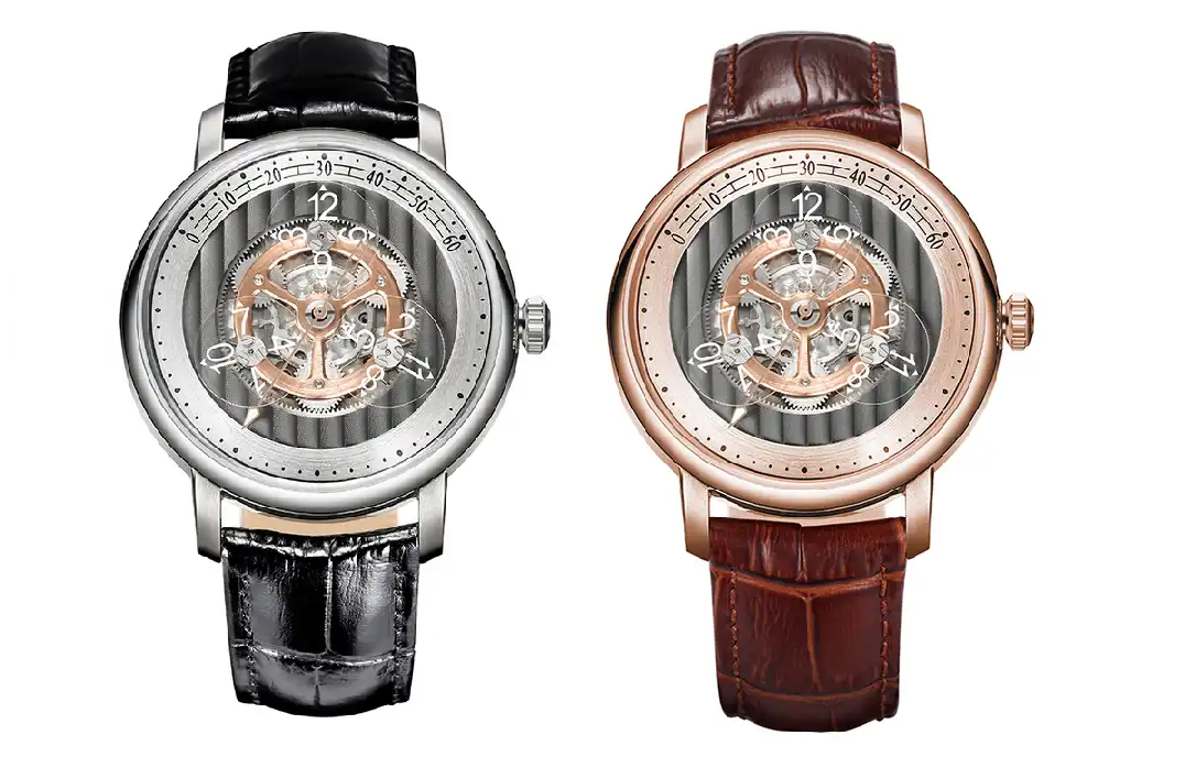 Das Design des Anzeigemoduls der Guangzhou Watch Home Precision Machinery Co. Ltd soll mit dem goldfarbenen Satellitenträger wohl das Aussehen des Anzeigemoduls der "Arnold & Son Golden Wheel" nachbilden.