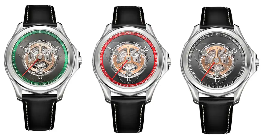 Daneben wurde aber eben auch ein zweites Modell mit eigenständigem Design herausgebracht, das es zunächst in 3 Farbvarianten gab, mit rotem, grünem oder schwarzem Chapter-Ring (Minuterie):