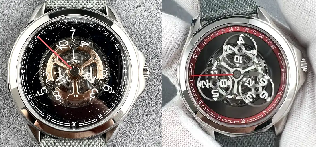 Links: Schwarze Variante mit "Aventurin"-Zifferblatt / Rechts: Variante mit skelettierten Satelliten mit Leuchtmasse (beachte die falsche, spiegelverkehrte Stunde 4).