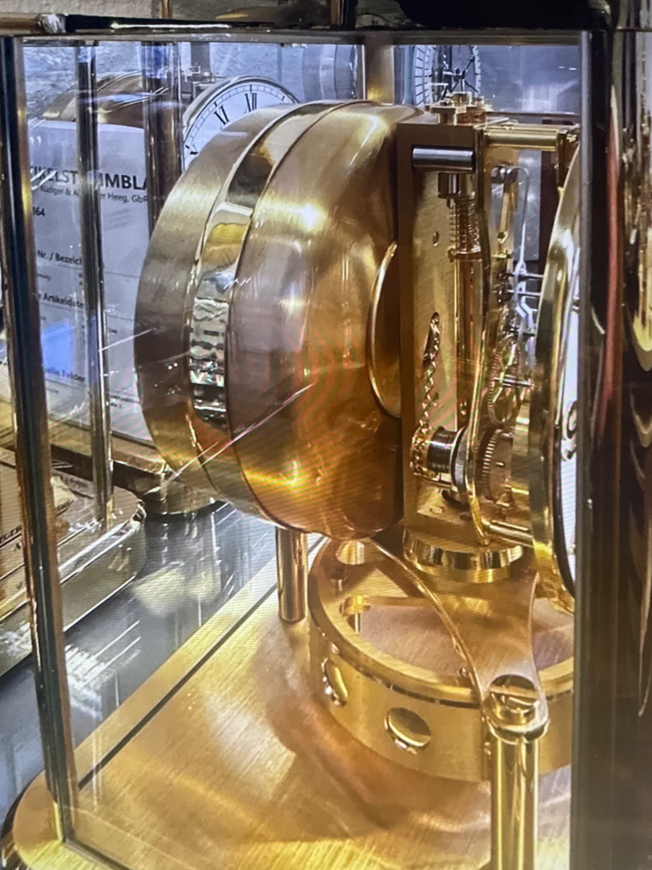 Dieses Gemisch hat einen sehr großen Ausdehnungskoeffizienten. Die Kraftübertragung erfolgt dann über eine Kette, von der Dose ausgehend zum Räderwerk und zur Ankergabel. Und damit komme ich zum „Pendel“. Es ist ein Torsionspendel mit einer Drehschwingung (Amplitude) von 540 Grad in einer Minute, also 1 1/2 Umdrehungen. Um das Pendel besonders leicht zu gestalten, wurde es aus der Legierung Elinvar gefertigt. Das Pendel selbst hat dann am Umfang verteilt Mulden, bzw. Vertiefungen um erstens das Gewicht zu verringern, und um einen schöneren optischen Eindruck zu erwecken. Und ich kann selbst als Besitzer der Uhren sagen, es ist jedesmal ein Genuß die Reflexionen und Lichtspiegelungen zu beobachten. Wobei dies immer mit einer Schrecksekunde verbunden ist, denn am Umkehrpunkt bleibt es für ca. eine Sekunde stehen, „oh Schreck, ist die Uhr defekt“. Eine „Ölschmierung“, nur an ganz wenigen Teilen, Aufzugsfeder? Die sucht man vergebens! Die Antriebsenergie ganz gering, nur ein Grad Temperaturdifferenz reicht für zwei Tage Gehdauer, und nur wenige Staubkörnchen können sie außer Betrieb setzen, deshalb mit Glas und Türe dagegen abgesichert, auch kein Sekundenzeiger, Läutewerk und dergleichen! Die durchschnittliche Gangabweichung ca. + - 1 Minute pro Monat. Man könnte auch sagen, das fast perfekte Perpetuum Mobile!