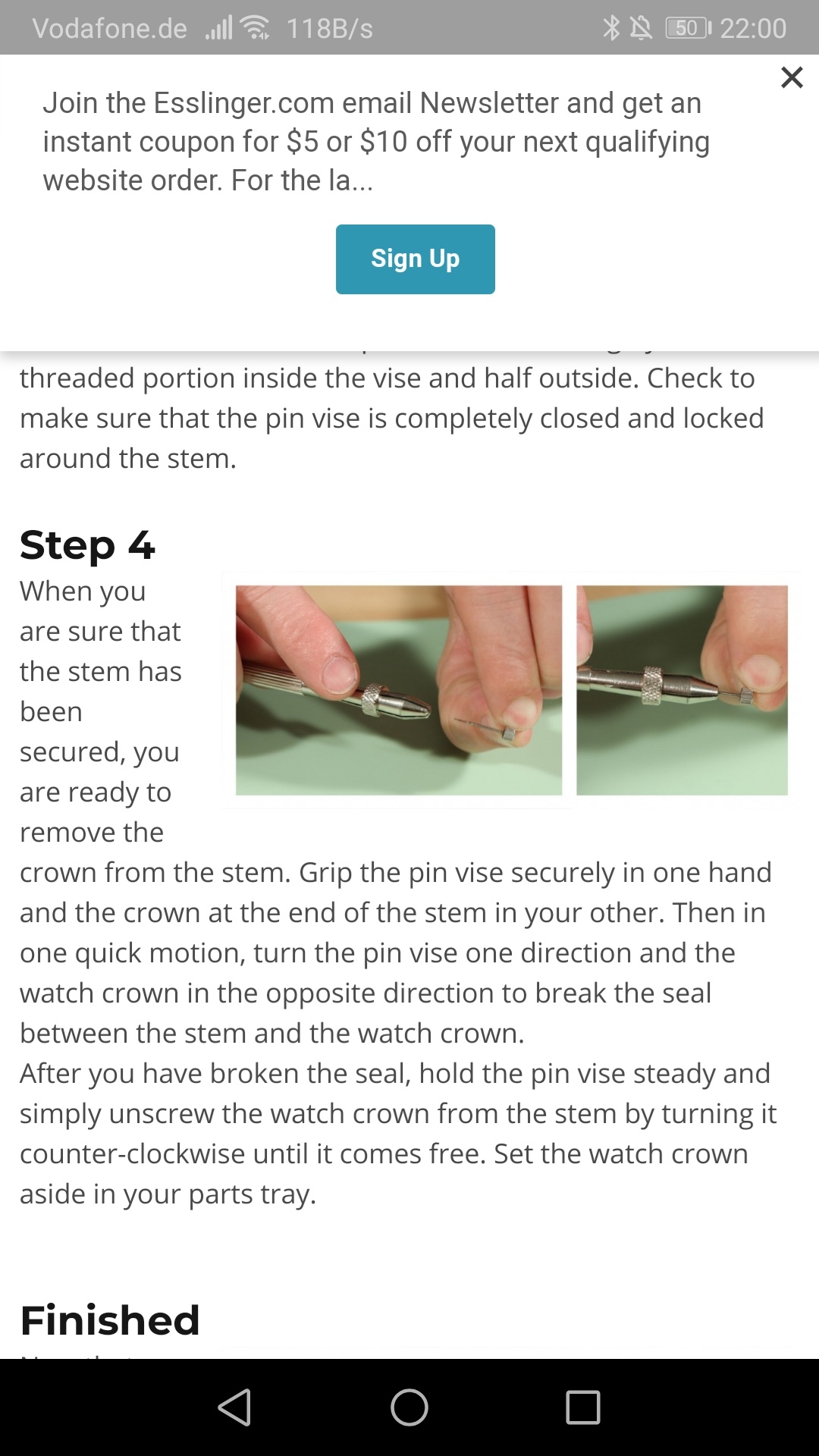 Vielen herzlichen Dank an euch beide. Nun bin ich schon einen Schritt weiter. Das Video von Andreas war insofern hilfreich, weil ich dort einen genialen Kniff gesehen habe, die Welle festzuhalten, damit man die Krone abdrehen kann. Ab 33:45 kann man sehen, wie der Bursche die Welle am "falschen" Ende einer Pinzette einklemmt. Das hat bei mir ebenfalls super geklappt, die Welle hält damit bombenfest und ich konnte die Krone recht einfach abdrehen.