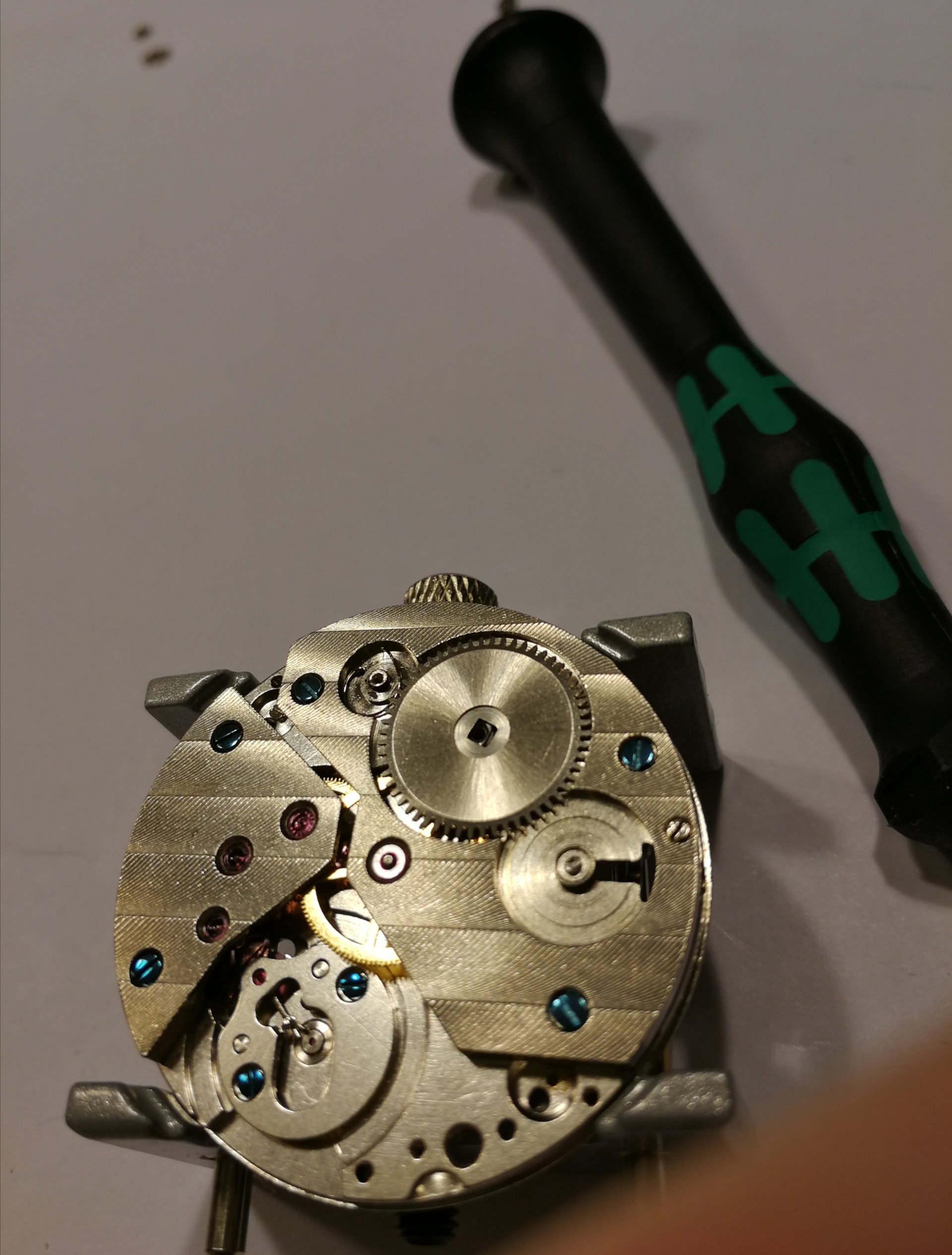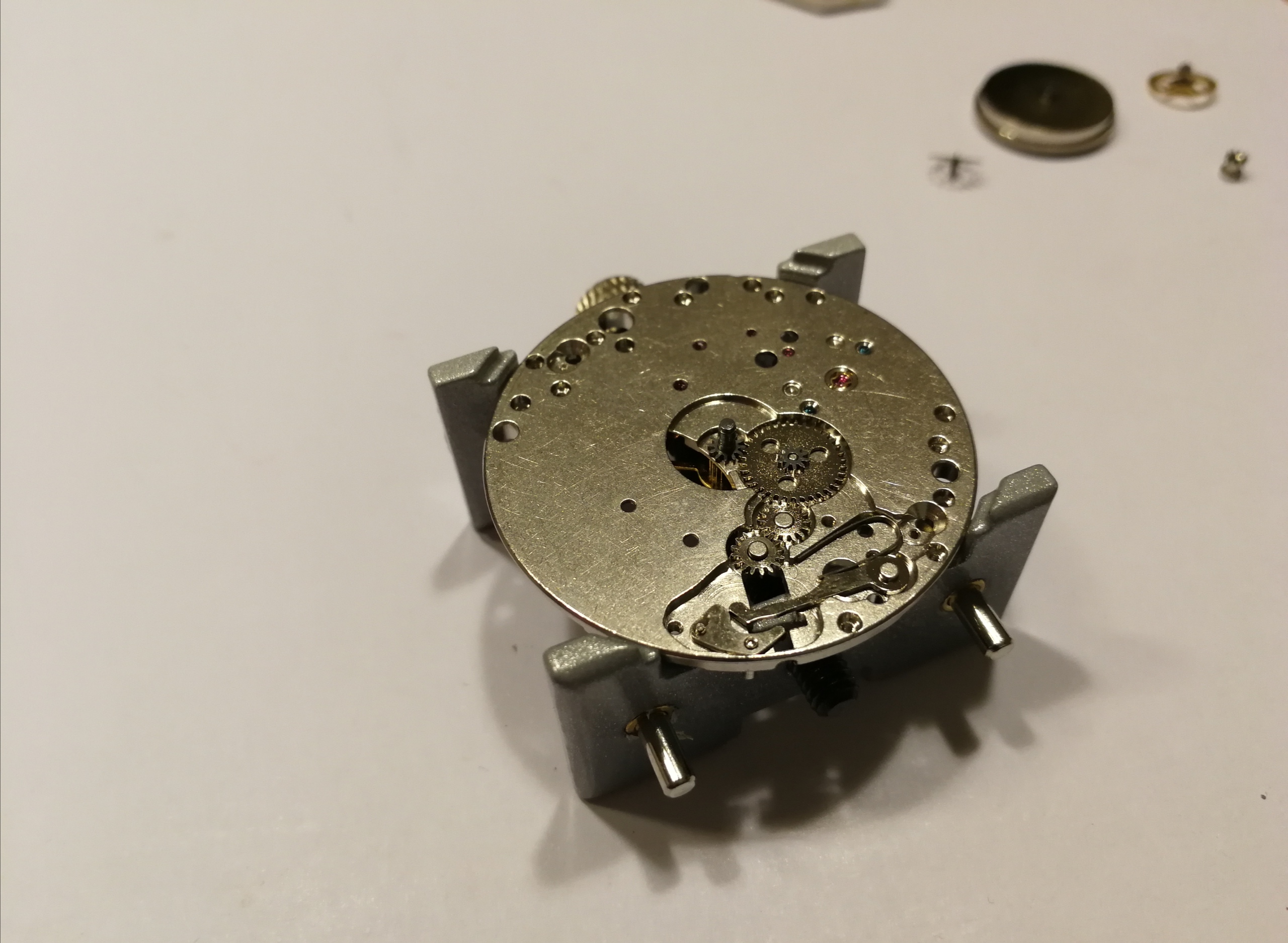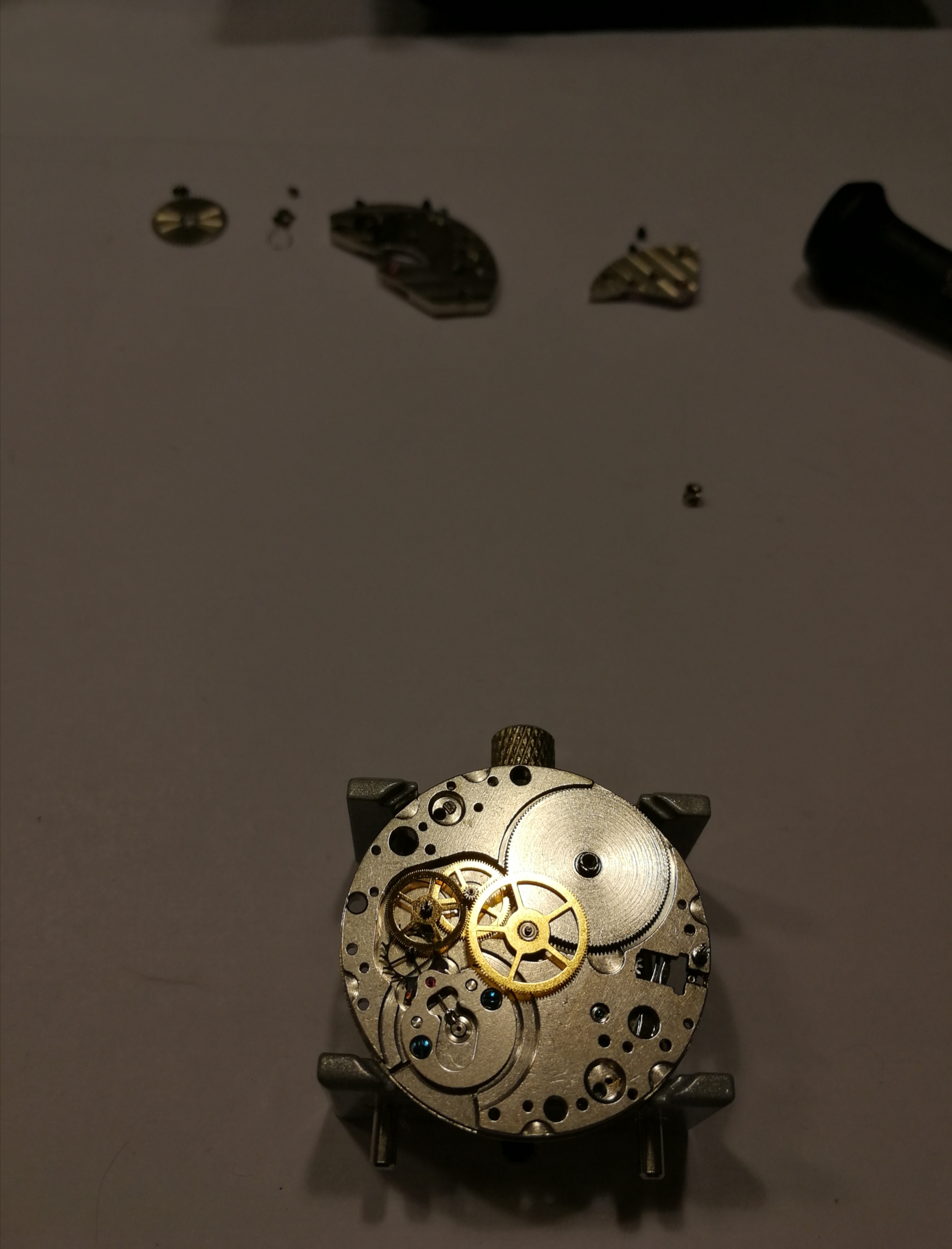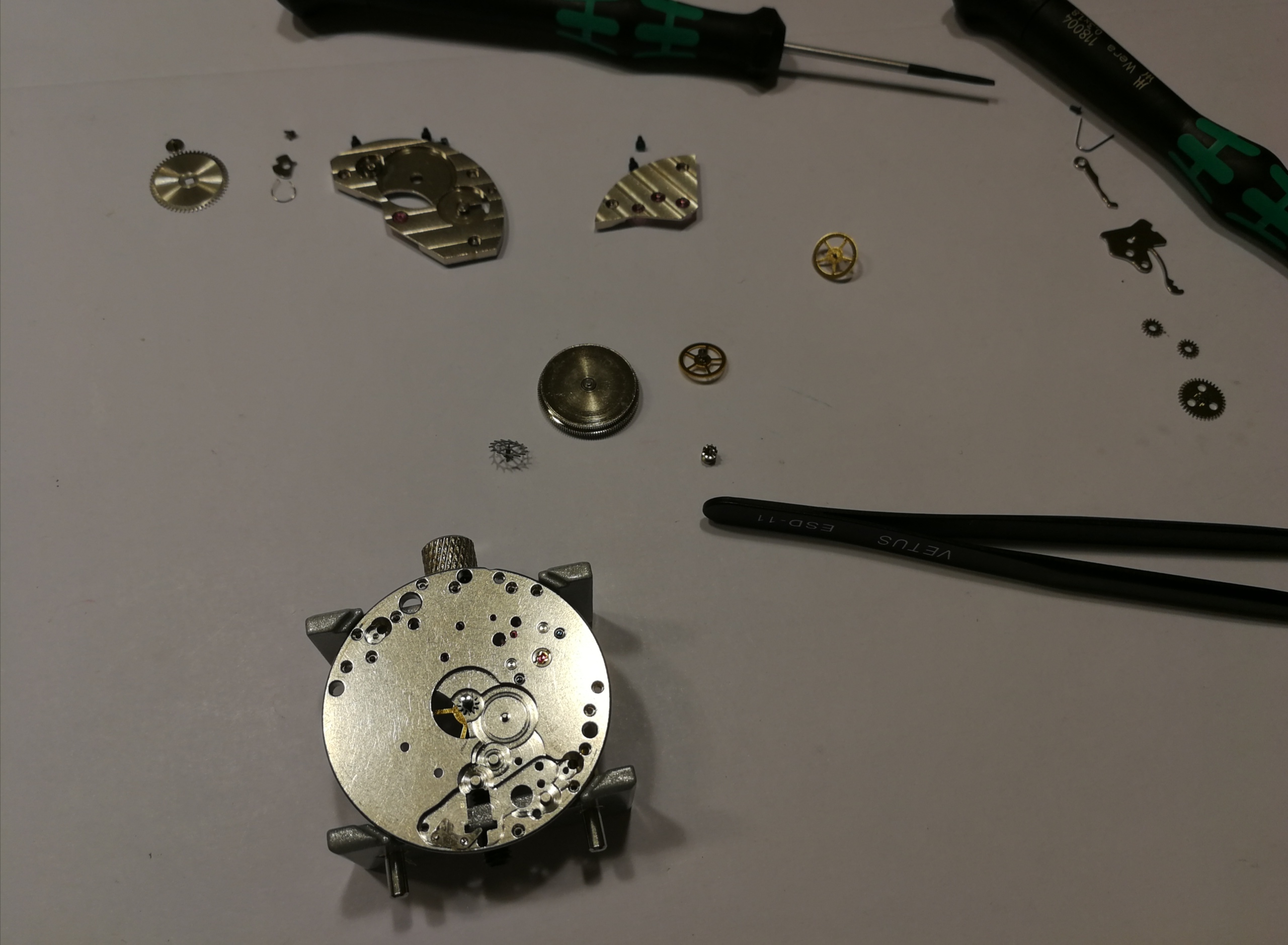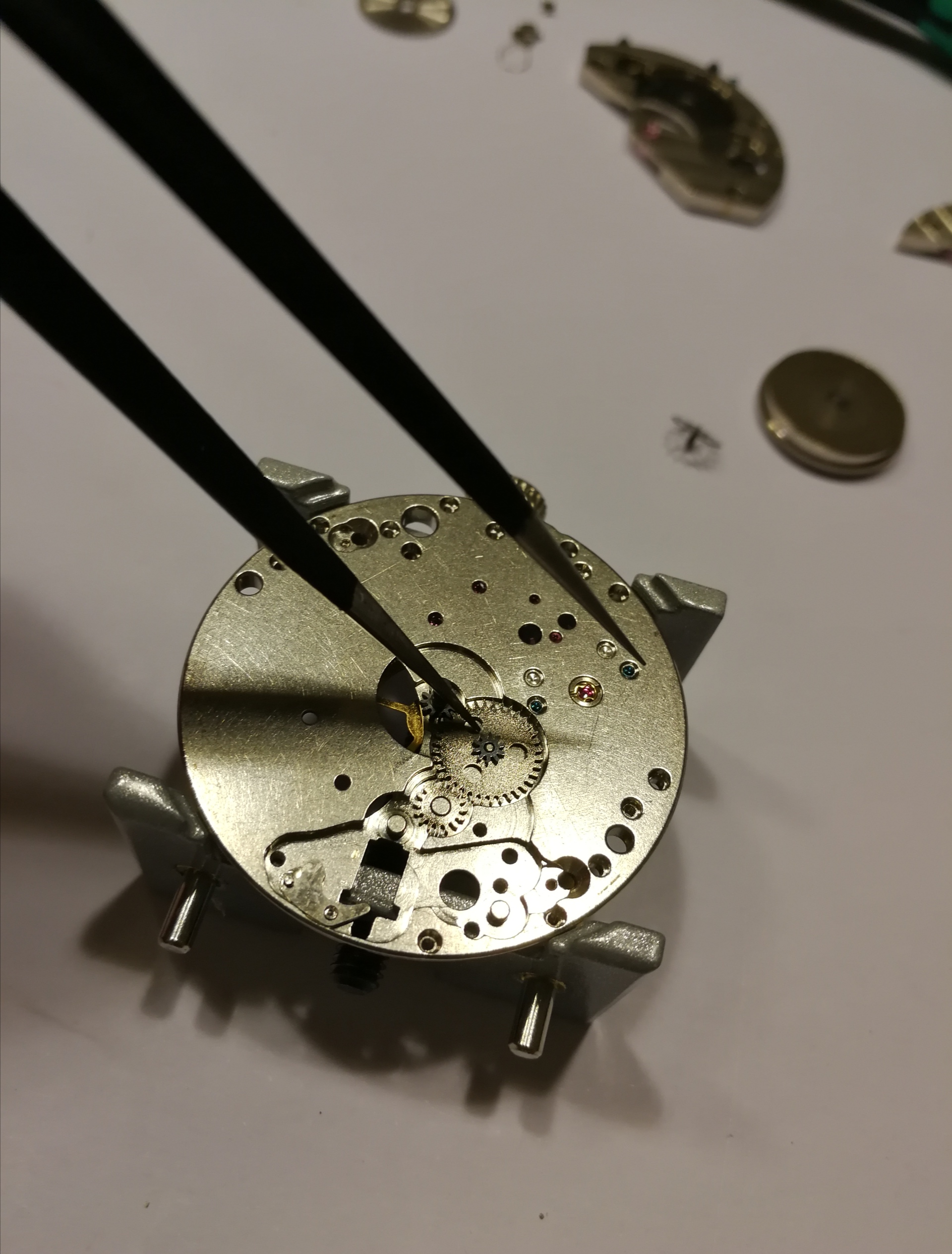 Ergänzend war noch das Problem, dass mein Werk extrem verklebt war, meine Theorie: Es hat sich jemand daran bereits versucht und viel zu viel und ein falsches Schmiermittel genommen. Man will mit der Pinzette ein Teil nehmen, drei hängen aber zusammen.