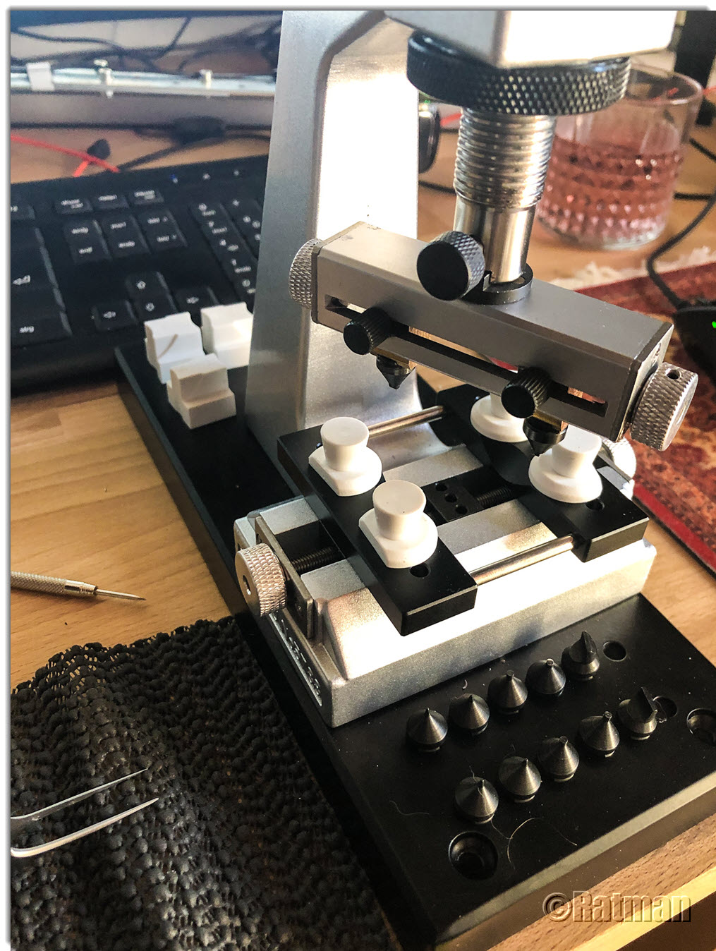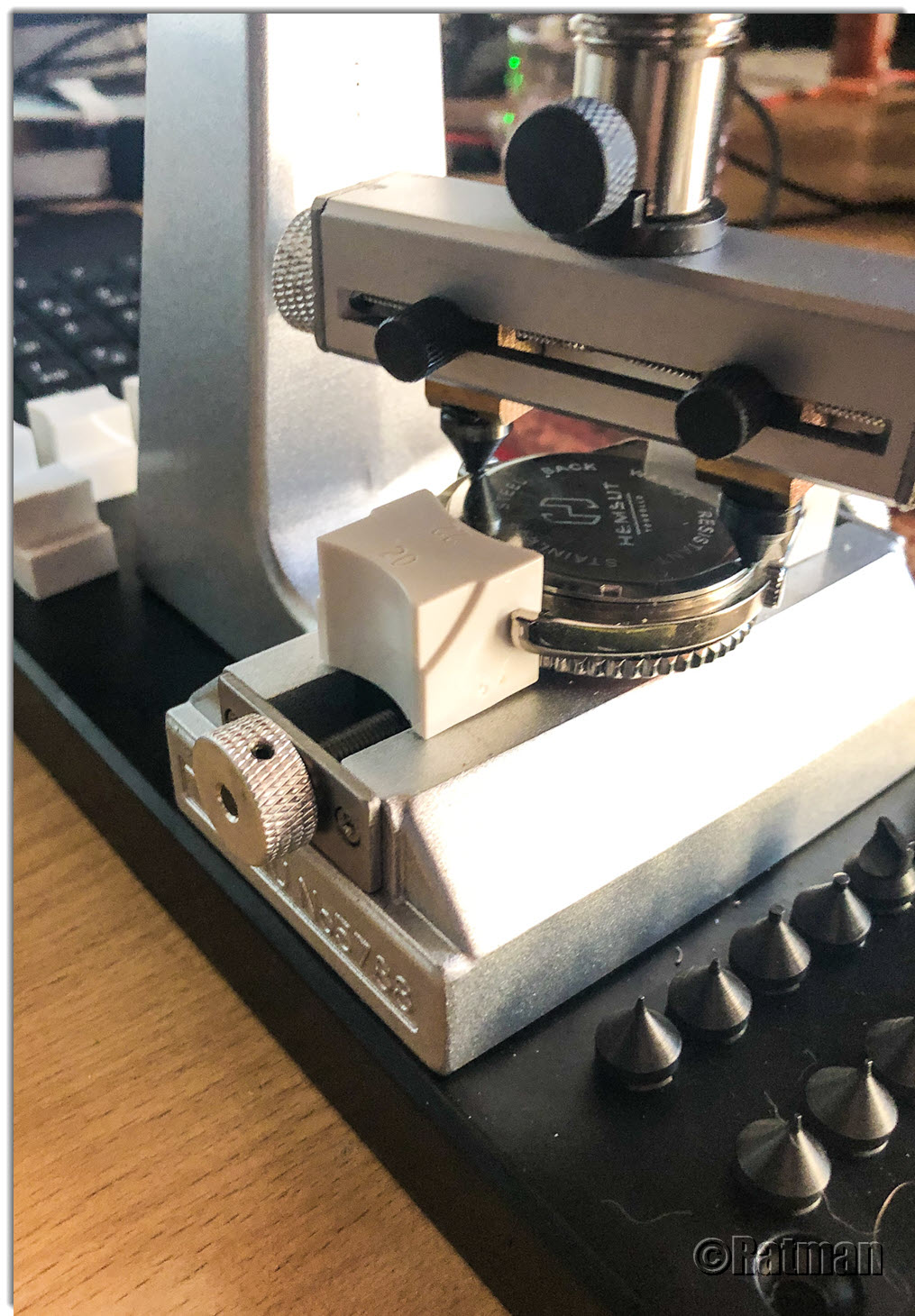 Die Grundplatte mit montiertem Werkzeugstock und integrierter Schraubzwinge sowie verschiedenen Aufsätzen zum Fixieren der Uhr