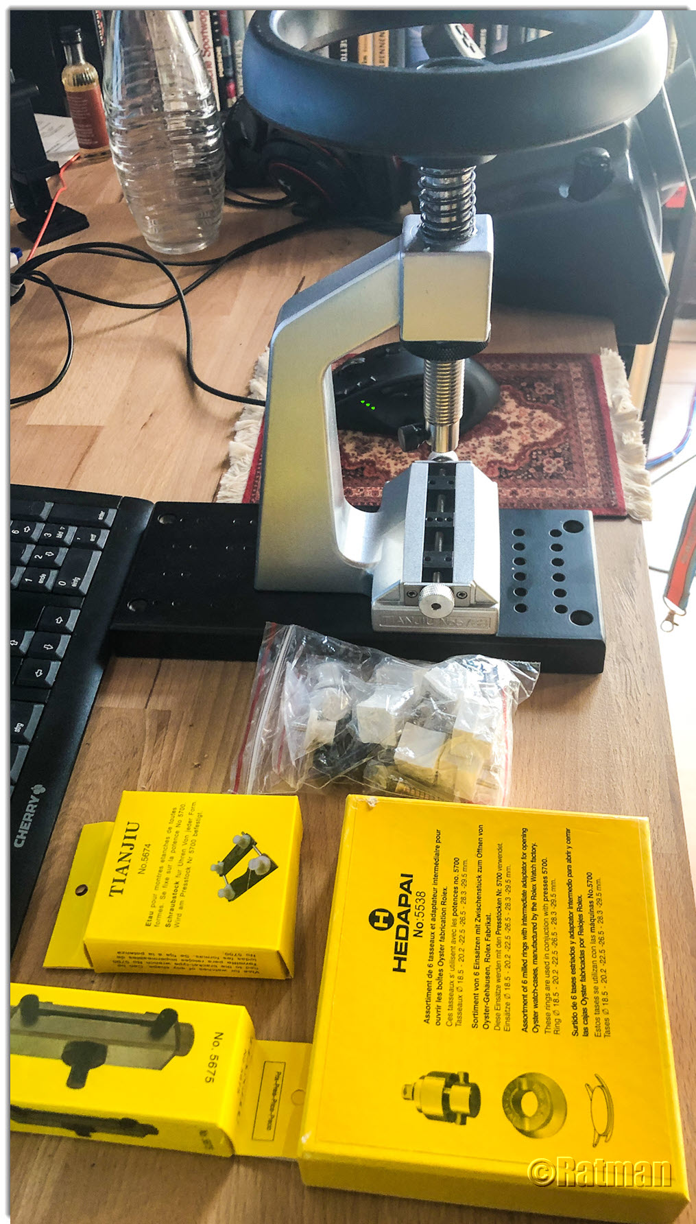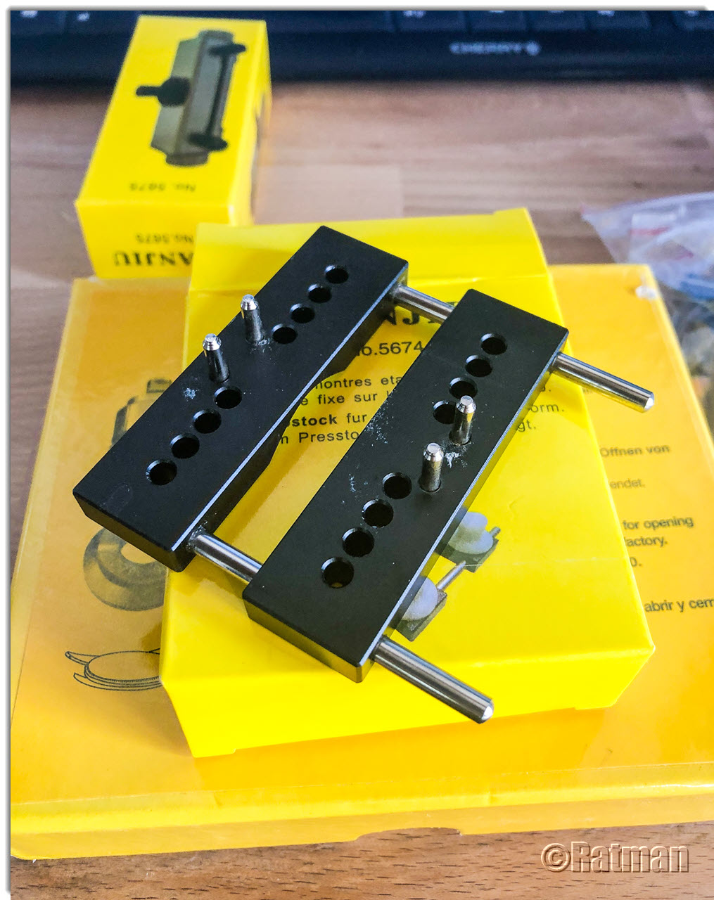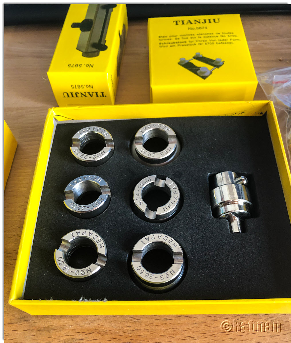 Letzte Woche habe ich mir in einem Anfall von Leichtsinn ein neues Tool zum Öffnen von Uhren mit Schraubdeckeln zugelegt. Ich bin da schon eine Weile drum herum geschlichen, aber die aufgerufenen Preise (ab 100,- EUR aufwärts) haben mich bisher immer abgeschreckt. Als ich dann letzte Woche in der Bucht auf ein Angebot gestoßen bin, bei dem es das Tool für rund 54,- EUR gab, inklusive einem Satz "RLX"-spezifischer Einsätze, musste ich zuschlagen.